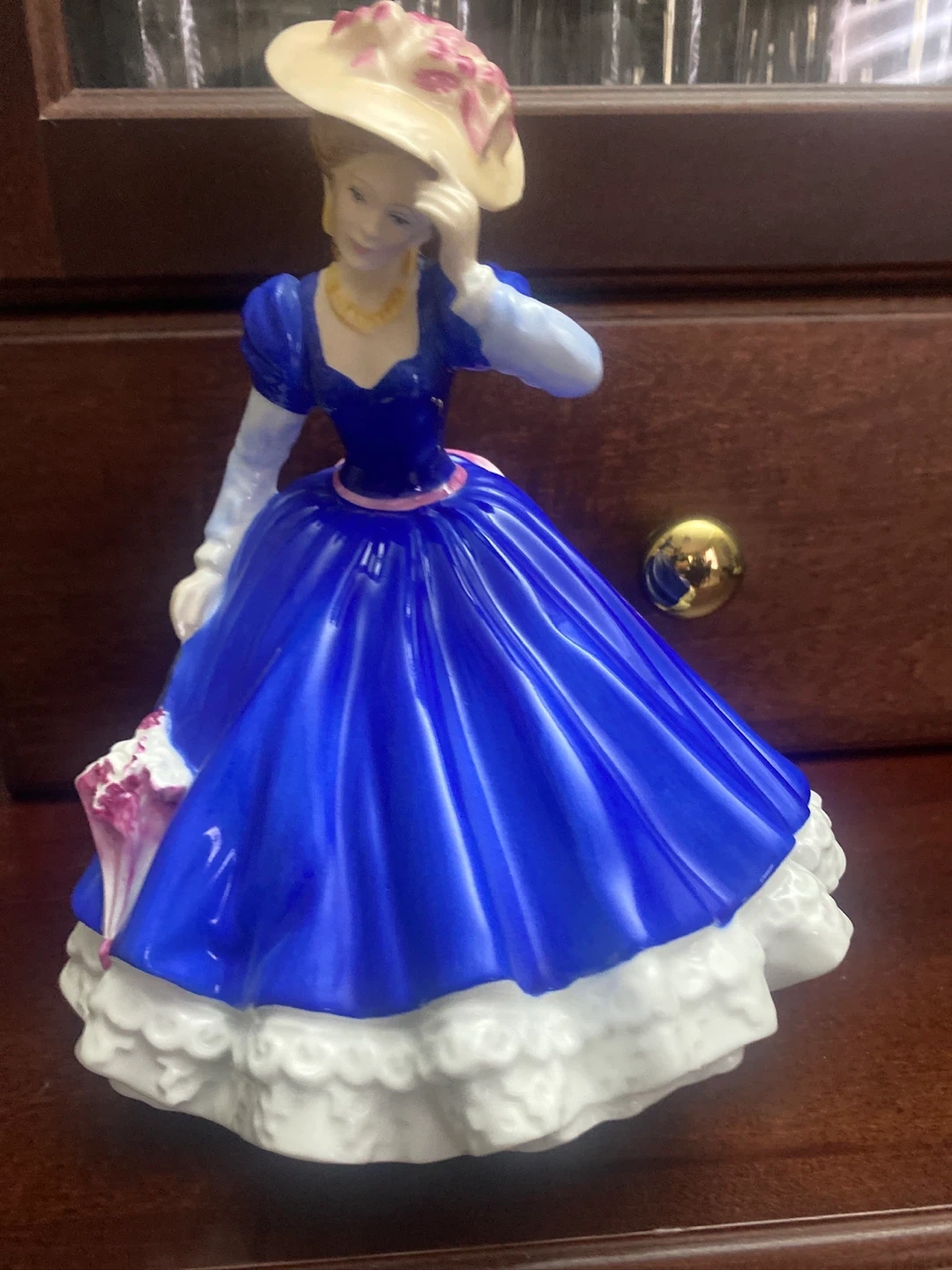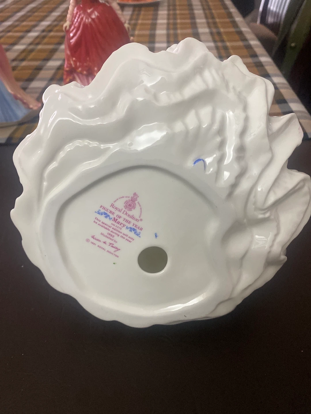 A Royal Doulton "Figure of the Year" named Mary from 1992. This collectible porcelain figurine features a woman in a blue gown holding an umbrella. It's a beautifully detailed piece.