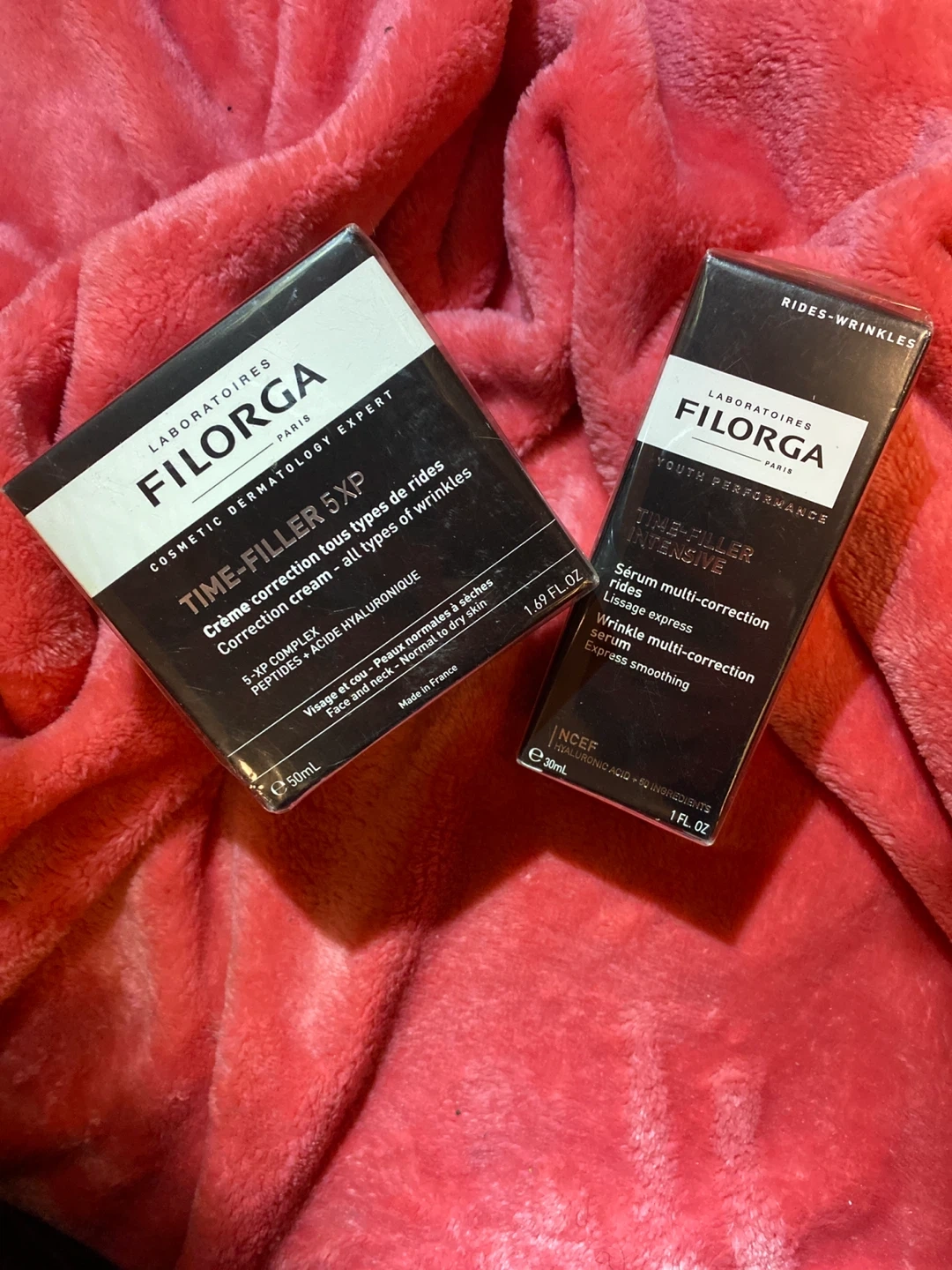 This bundle includes Filorga Time-Filler Intensive Serum and Filorga Time-Filler 5XP Correction Cream. The serum is 30ml and the cream is 50ml. Both are designed to address wrinkles and provide express smoothing.
