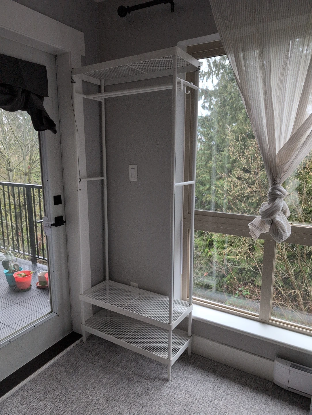 A white metal garment rack with two mesh shelves for storage. It features a hanging rod and a clean, modern design. This rack is great for organizing clothes and accessories in hallways or bedrooms.
