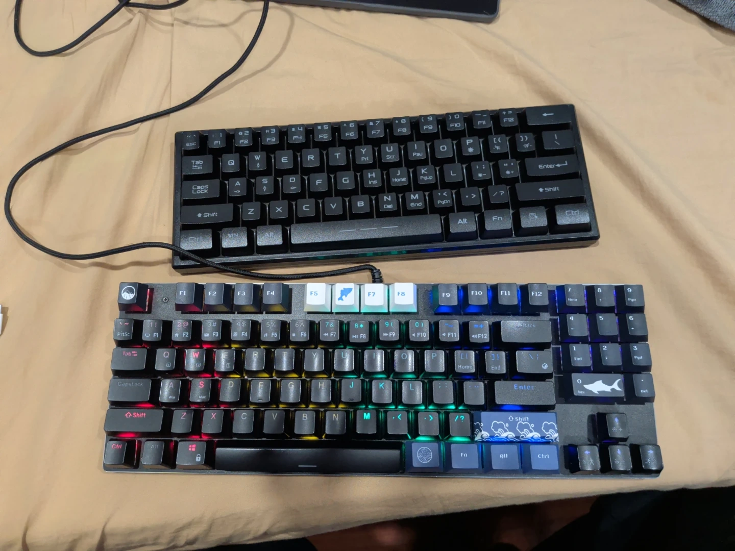 This is a wired gaming keyboard with custom keycaps. It features RGB backlighting for a vibrant gaming setup. The keyboard is designed for responsiveness and durability during intense gaming sessions. And the other one is Bluetooth and is also RGB. And the offer is 2 for 50$