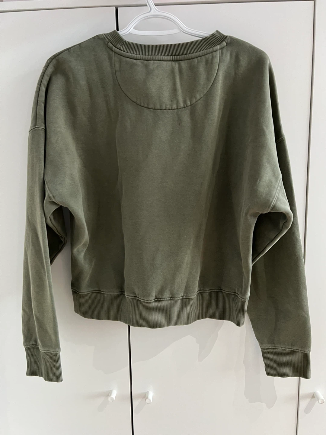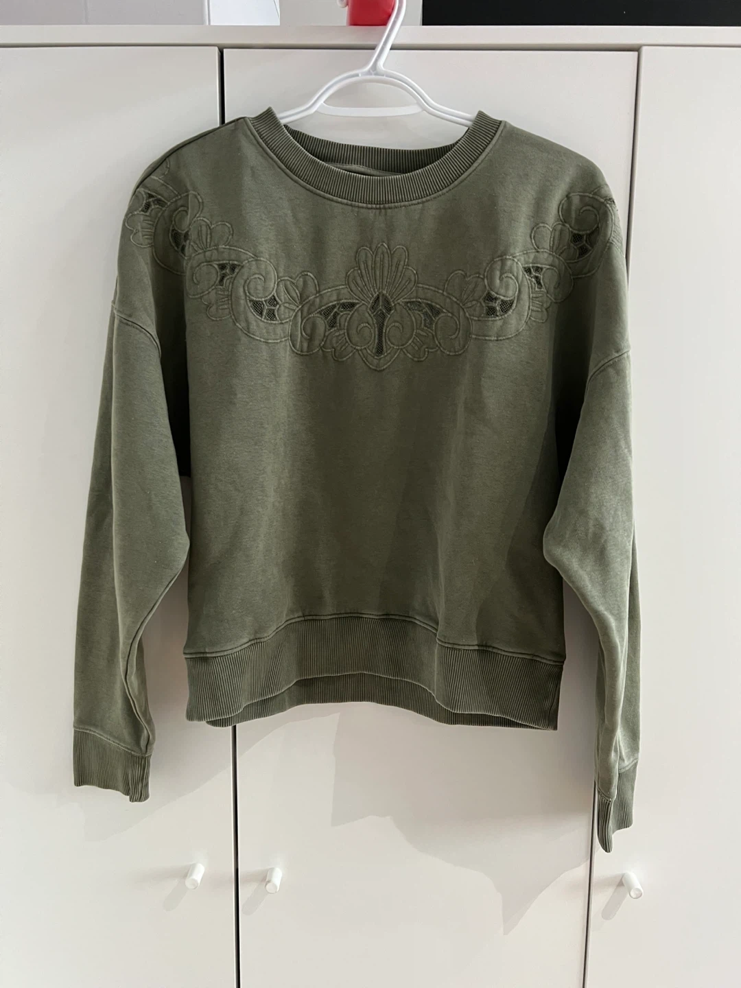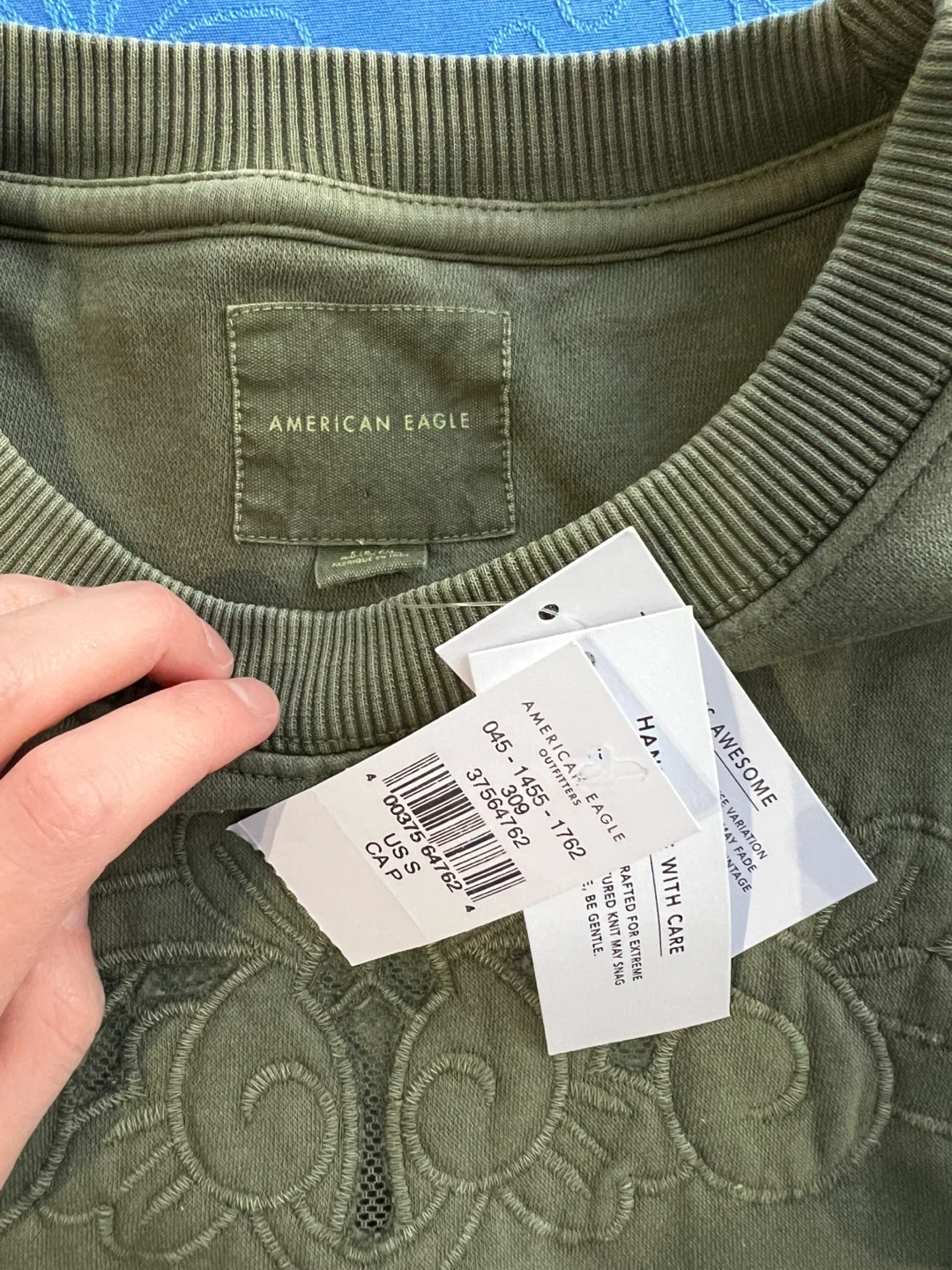This American Eagle crewneck sweatshirt comes in a muted green color. It features embroidered detailing across the chest and a comfortable, relaxed fit. Size is small.