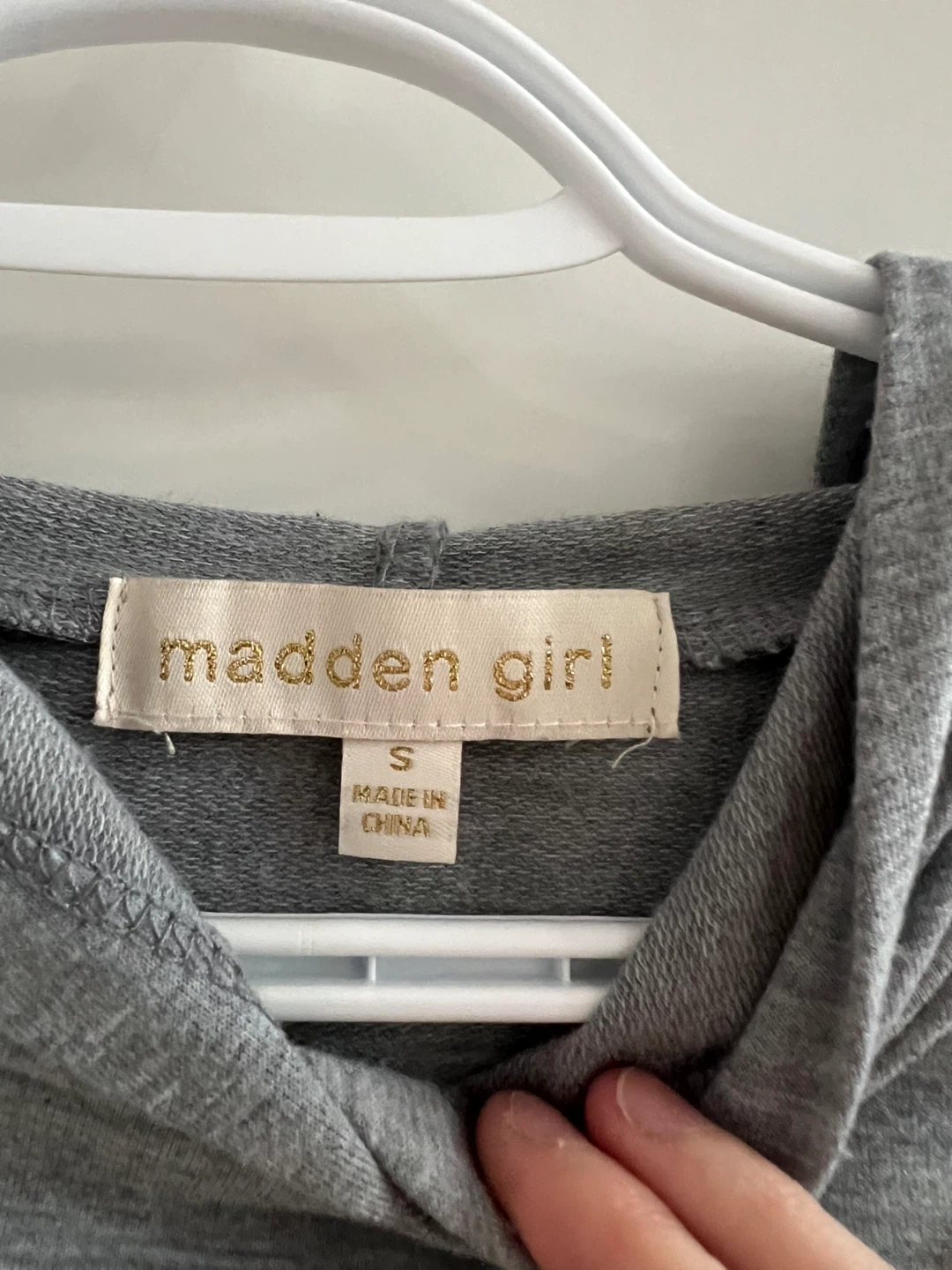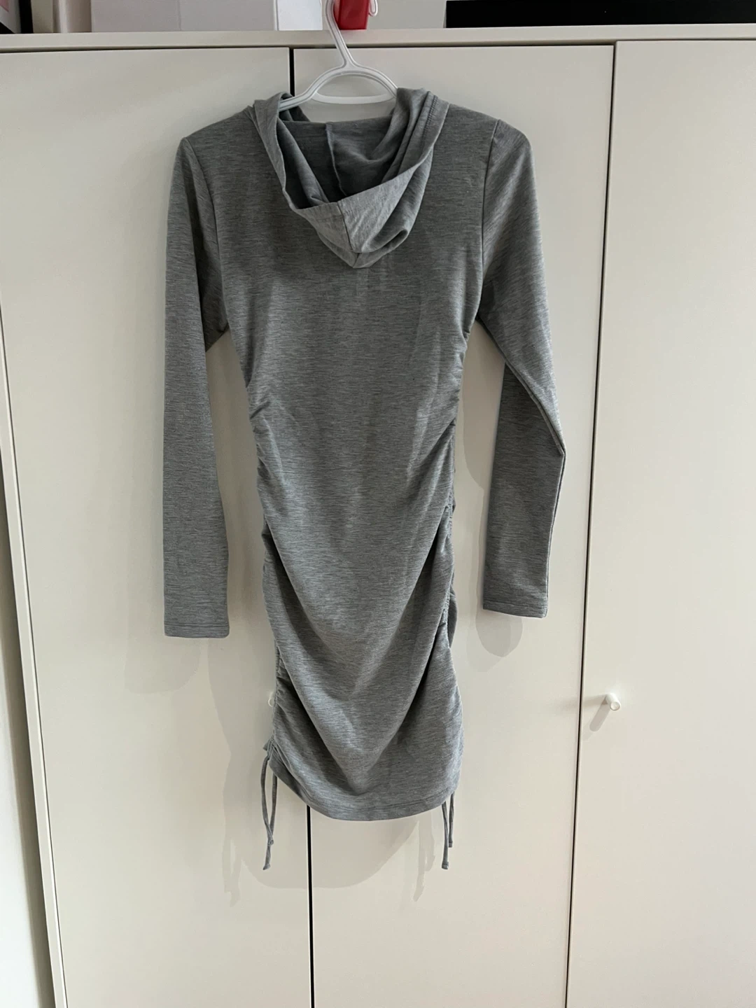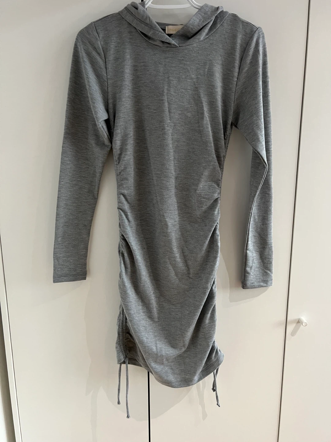 This Madden Girl hoodie dress is gray and features ruched detailing on the sides with adjustable drawstrings. It's a size small. Made from a soft fabric, it's comfortable for everyday wear.