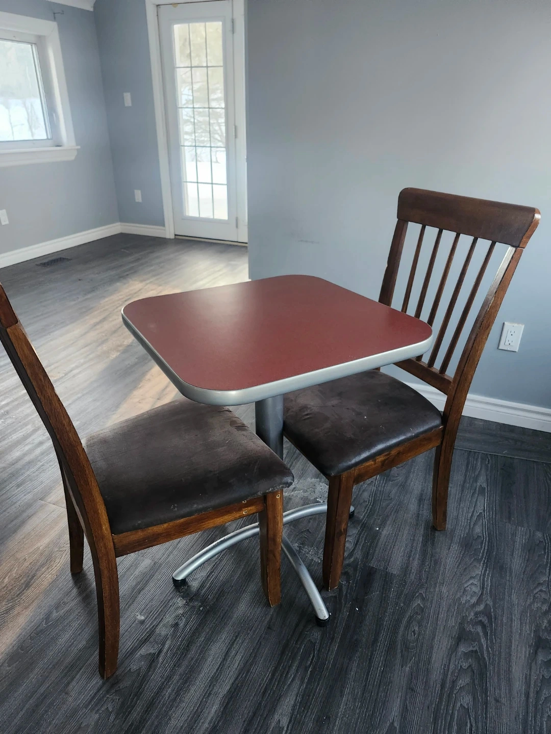 This set includes a square top table with a maroon surface and a metal pedestal base. Two wooden chairs with dark upholstered seats and backs are included. It's a compact dining set suitable for a small space.