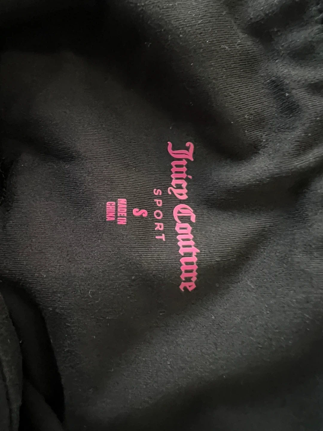 Black Juicy Couture Sport leggings with beige and white side panel details. Includes a convenient side pocket perfect for a phone or small items. Material is stretchy and comfortable for active wear.