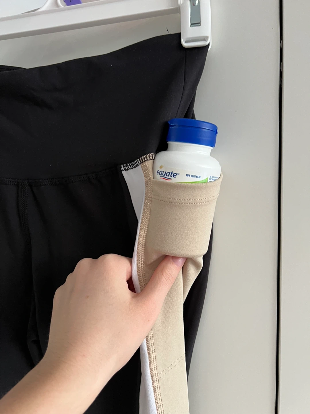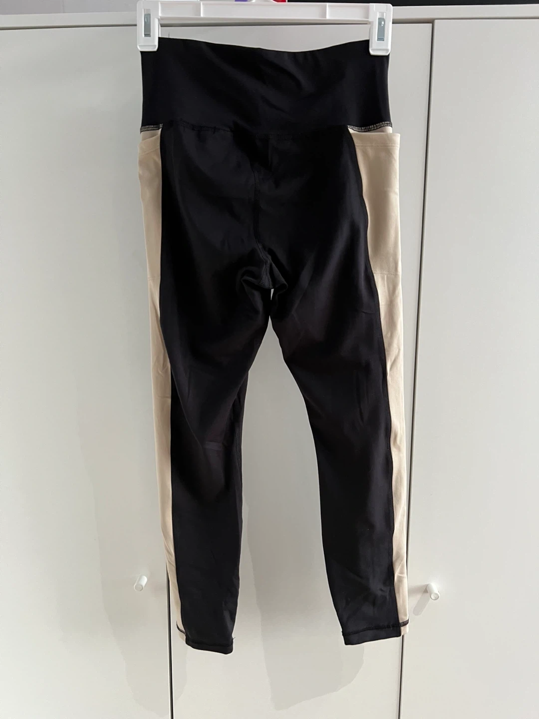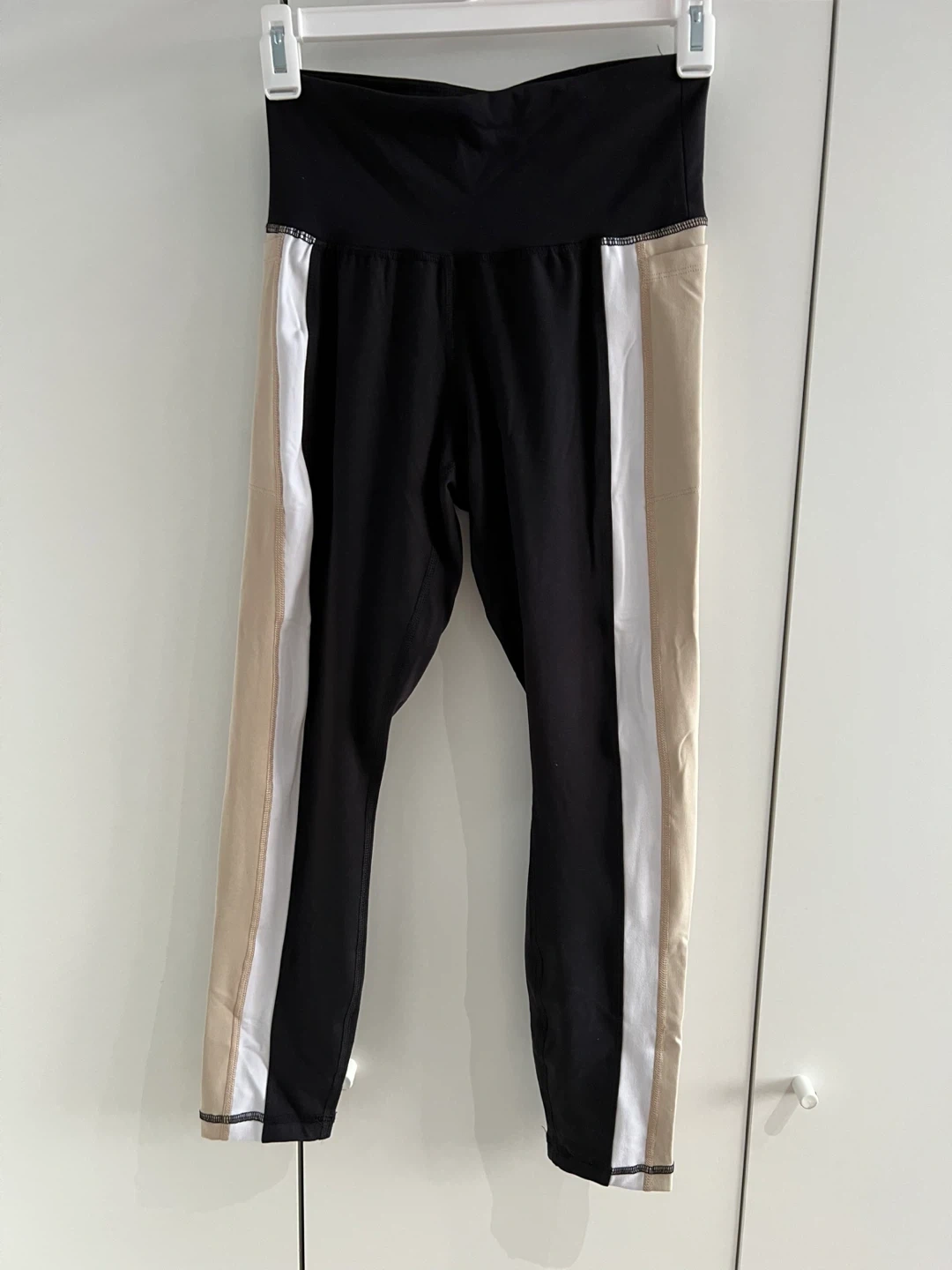 Black Juicy Couture Sport leggings with beige and white side panel details. Includes a convenient side pocket perfect for a phone or small items. Material is stretchy and comfortable for active wear.