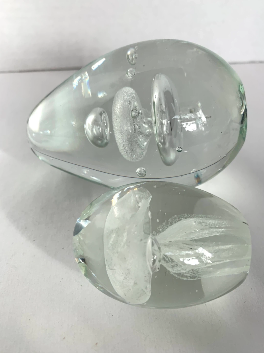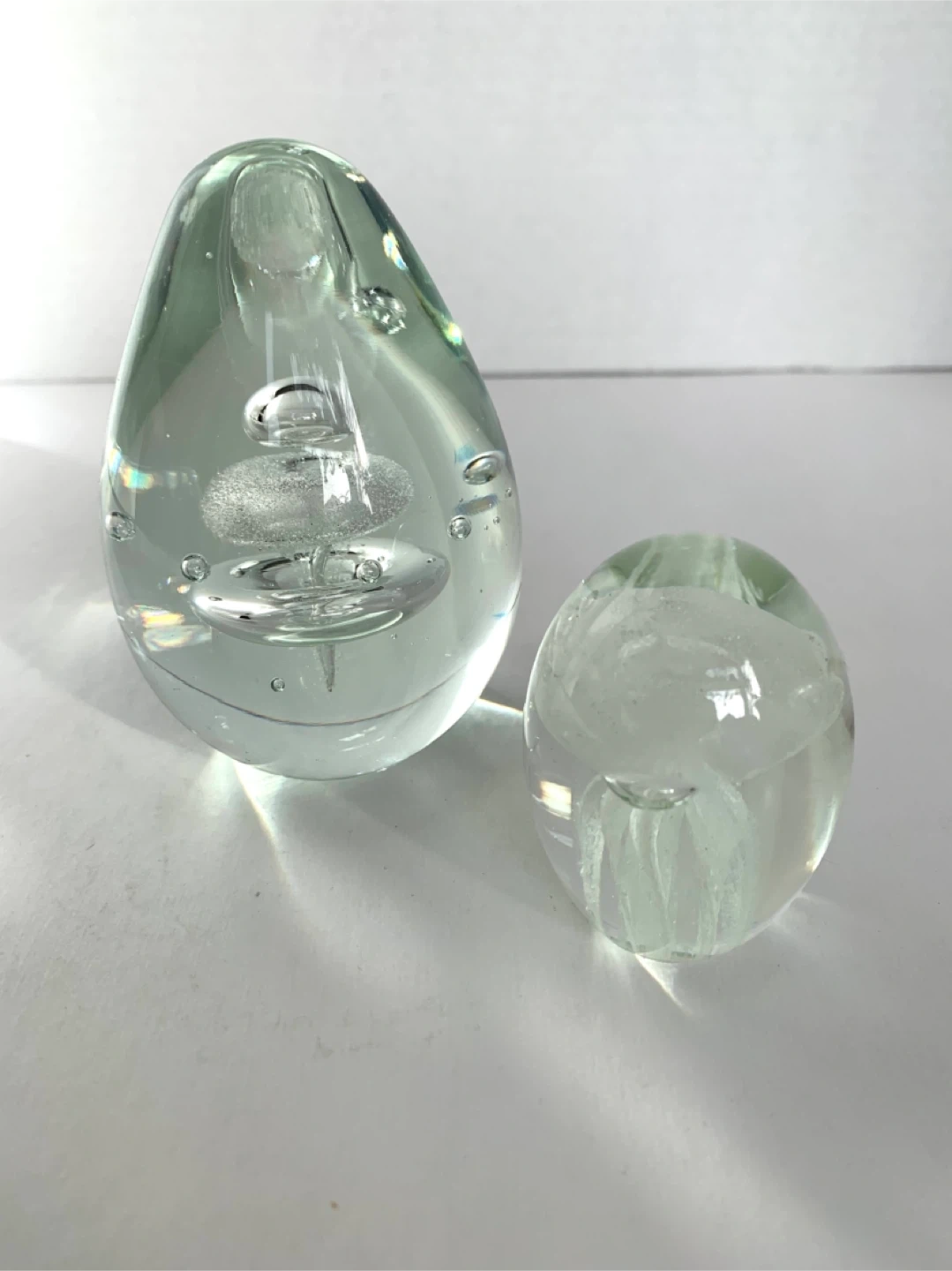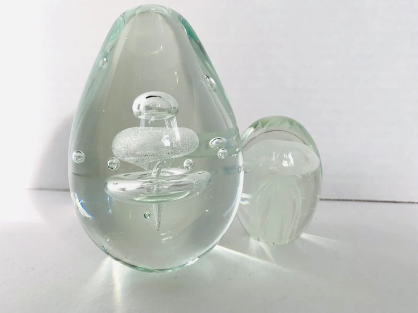 Clear glass paperweight with rising bubbles and a white jellyfish design inside paperweight. Two beautiful decorative pieces. Perfect for adding a touch of whimsy to your desk!