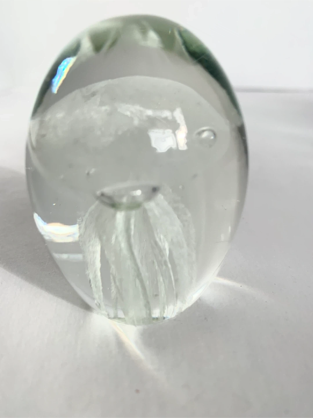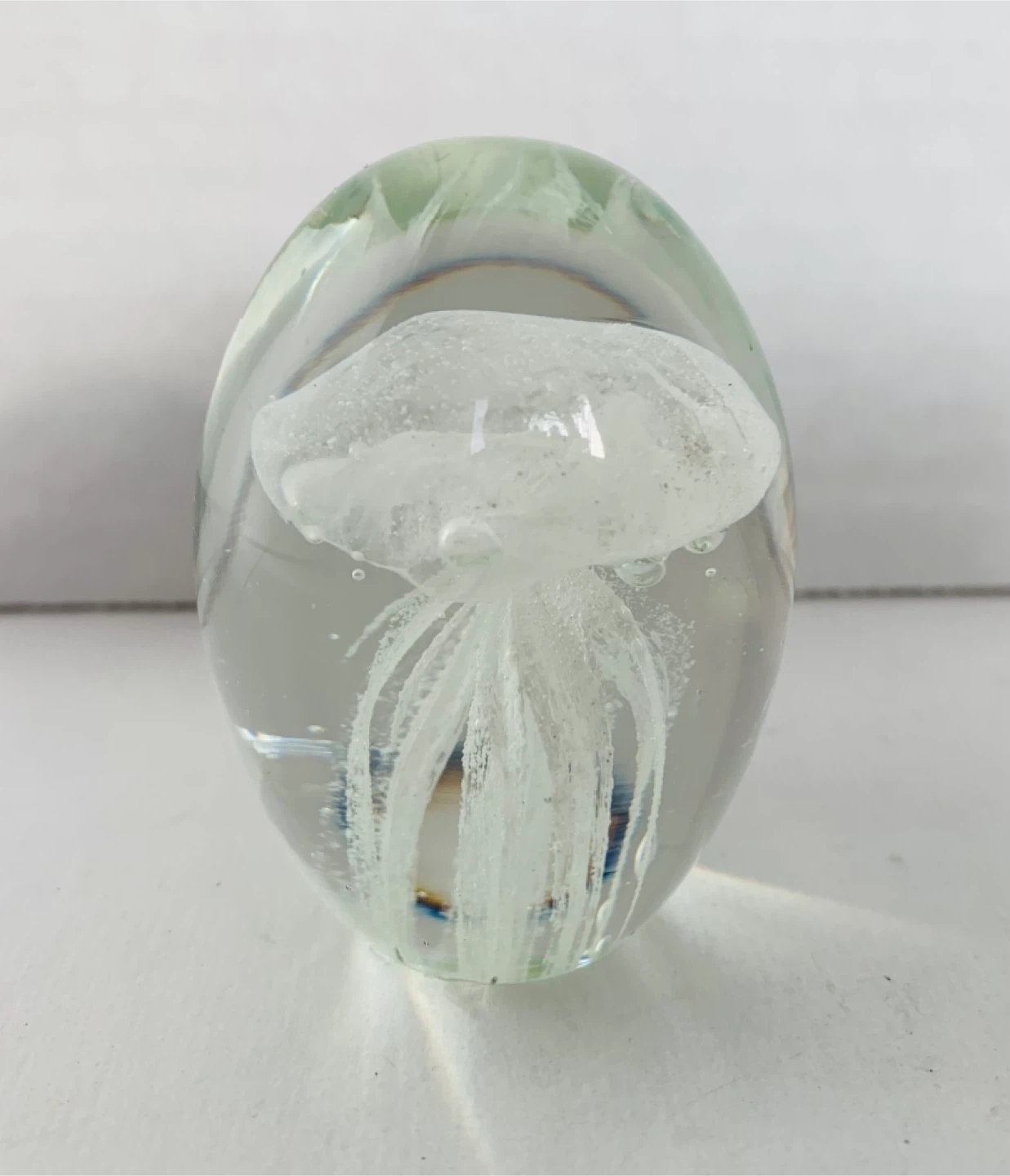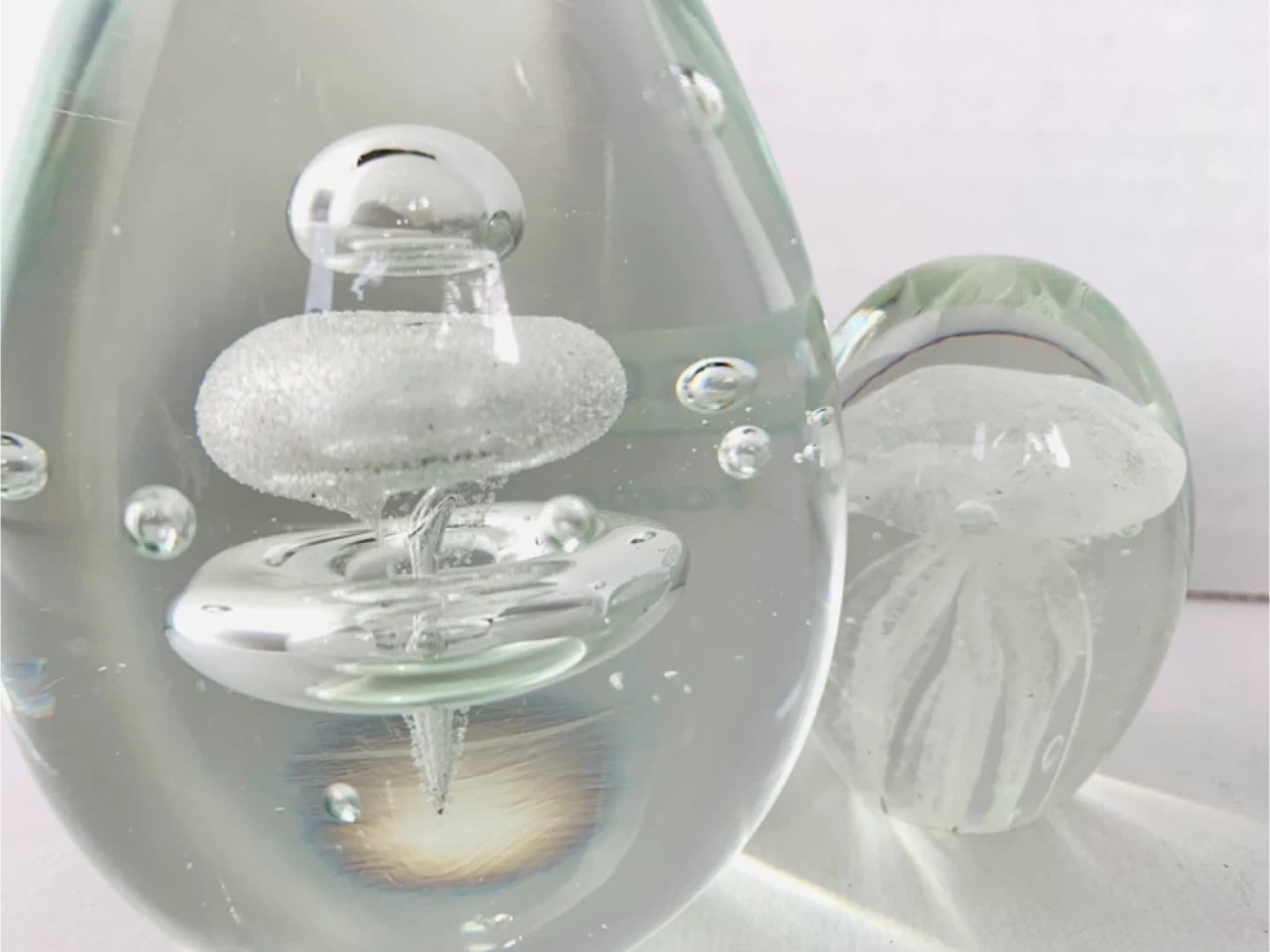Clear glass paperweight with rising bubbles and a white jellyfish design inside paperweight. Two beautiful decorative pieces. Perfect for adding a touch of whimsy to your desk!