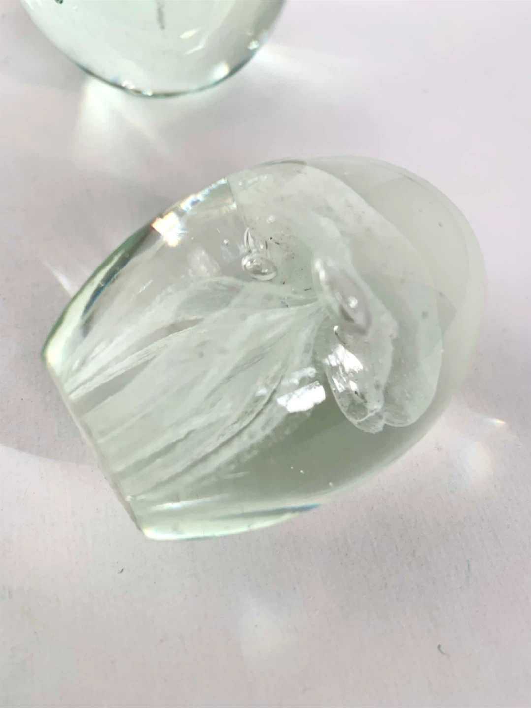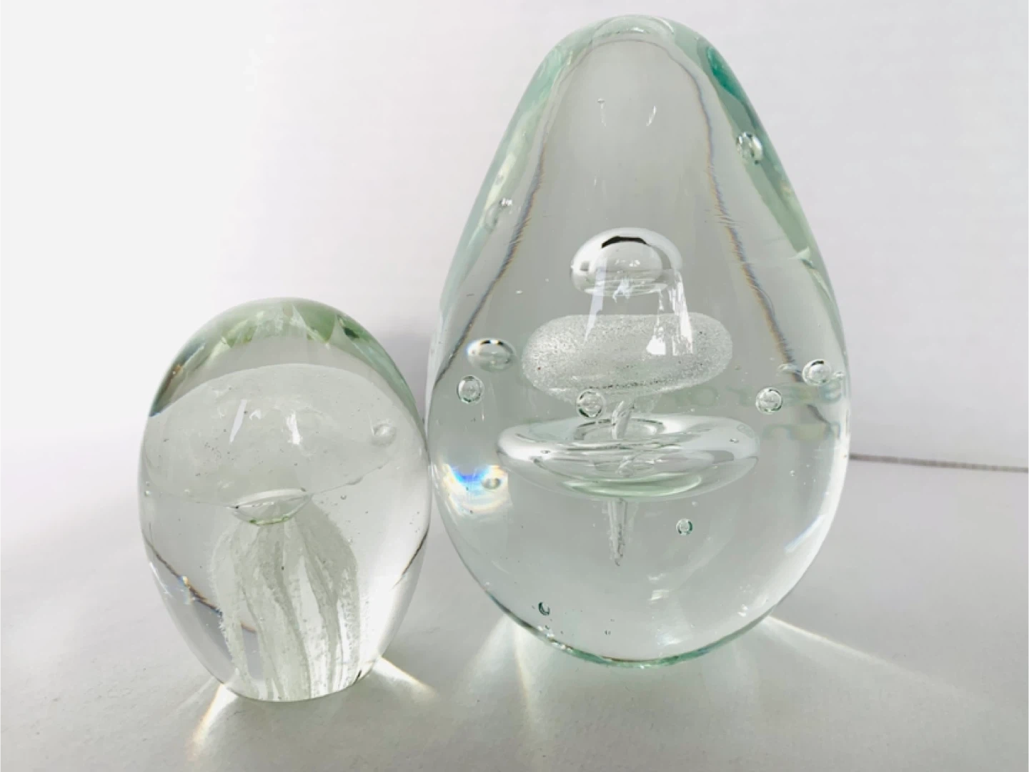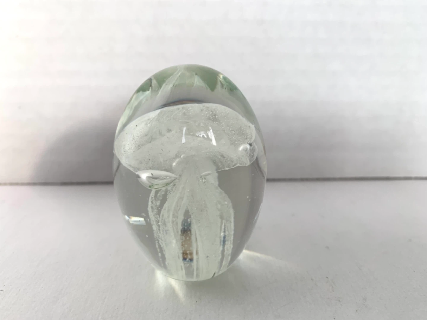 Clear glass paperweight with rising bubbles and a white jellyfish design inside paperweight. Two beautiful decorative pieces. Perfect for adding a touch of whimsy to your desk!
