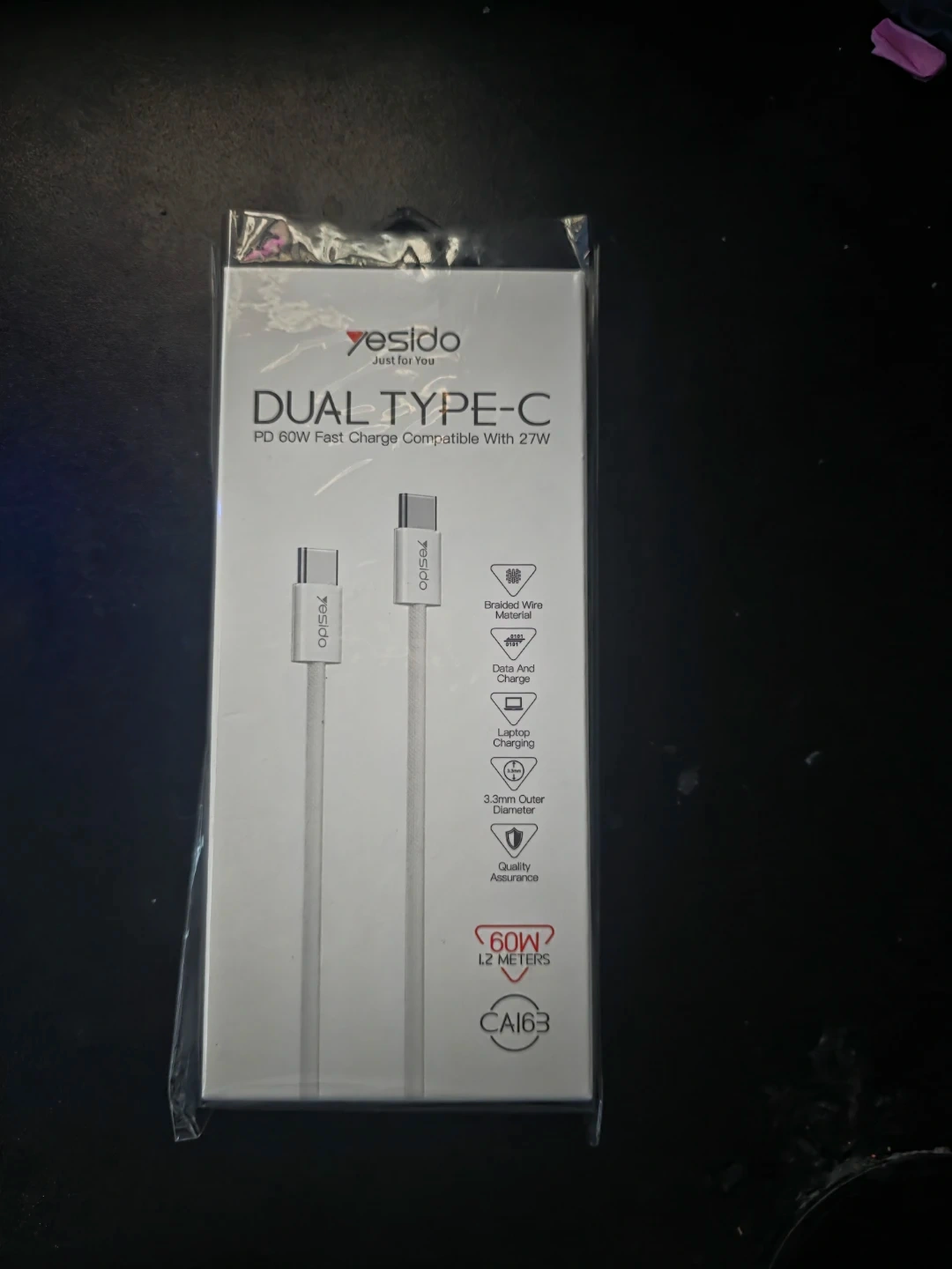 This Yesido cable offers PD 60W fast charging, compatible with 27W devices. It features a braided wire material and supports data and charge functions. The cable is 2 meters long and has a 3.3mm outer diameter.
