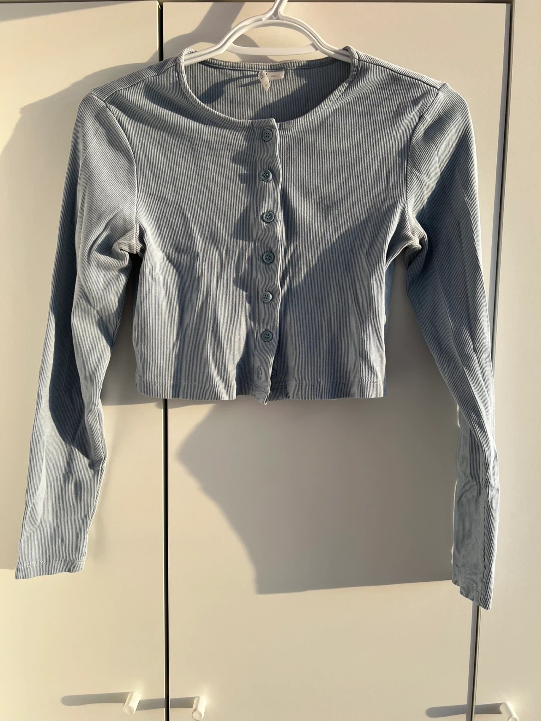 This is a light blue, ribbed, cropped long-sleeve top. It features a button-up front and a crew neckline. The material is a soft knit blend.