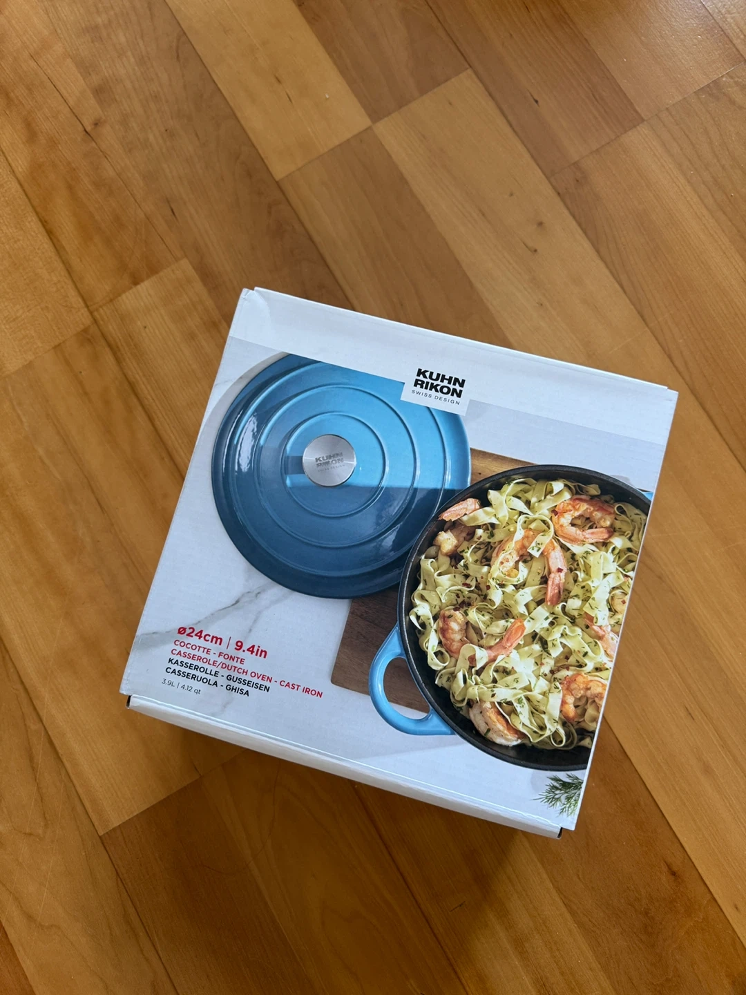 This is a Kuhn Rikon 24cm (9.4 inch) cast iron Dutch oven. It's blue and includes the lid. Oven safe up to 450F.