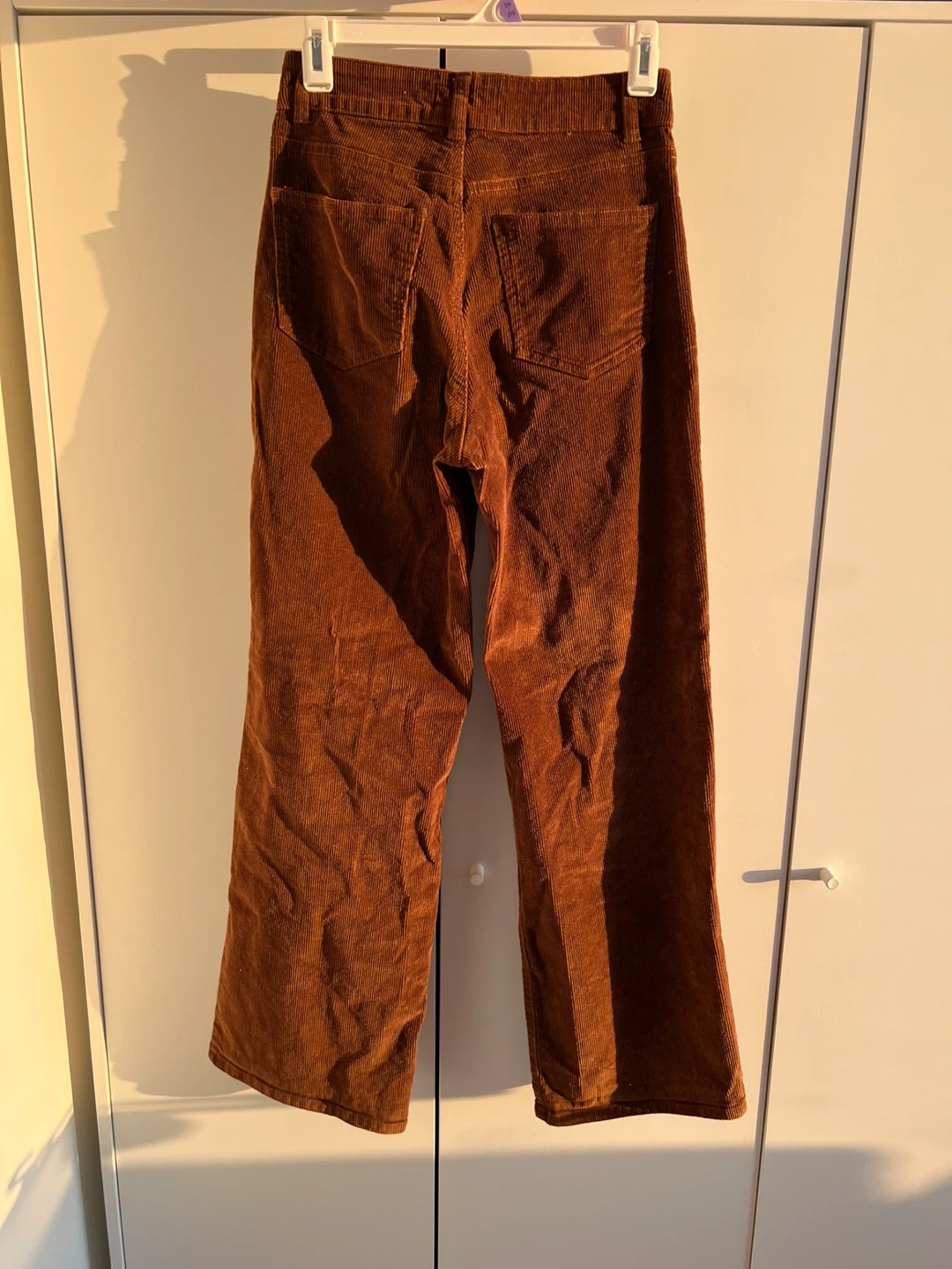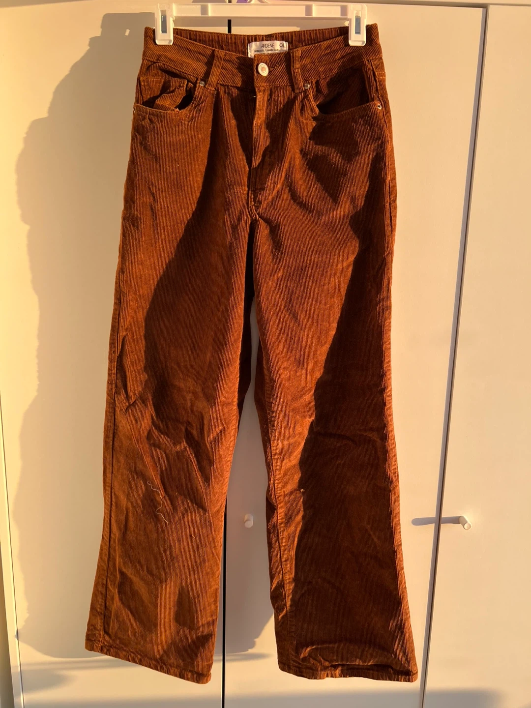 Ardene brown corduroy High Waisted pants with a wide leg fit. High rise style. Made in Bangladesh.