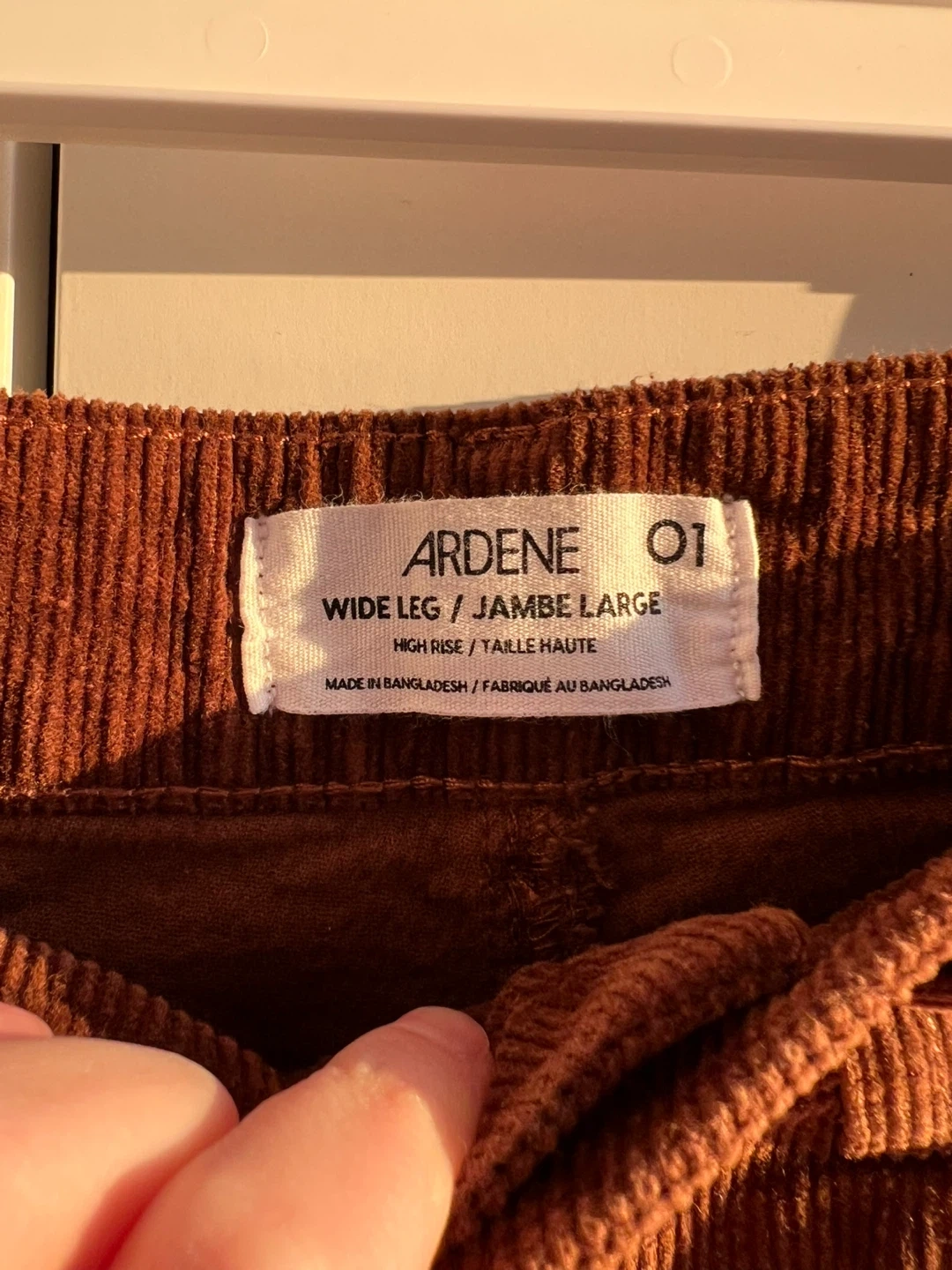 Ardene brown corduroy High Waisted pants with a wide leg fit. High rise style. Made in Bangladesh.