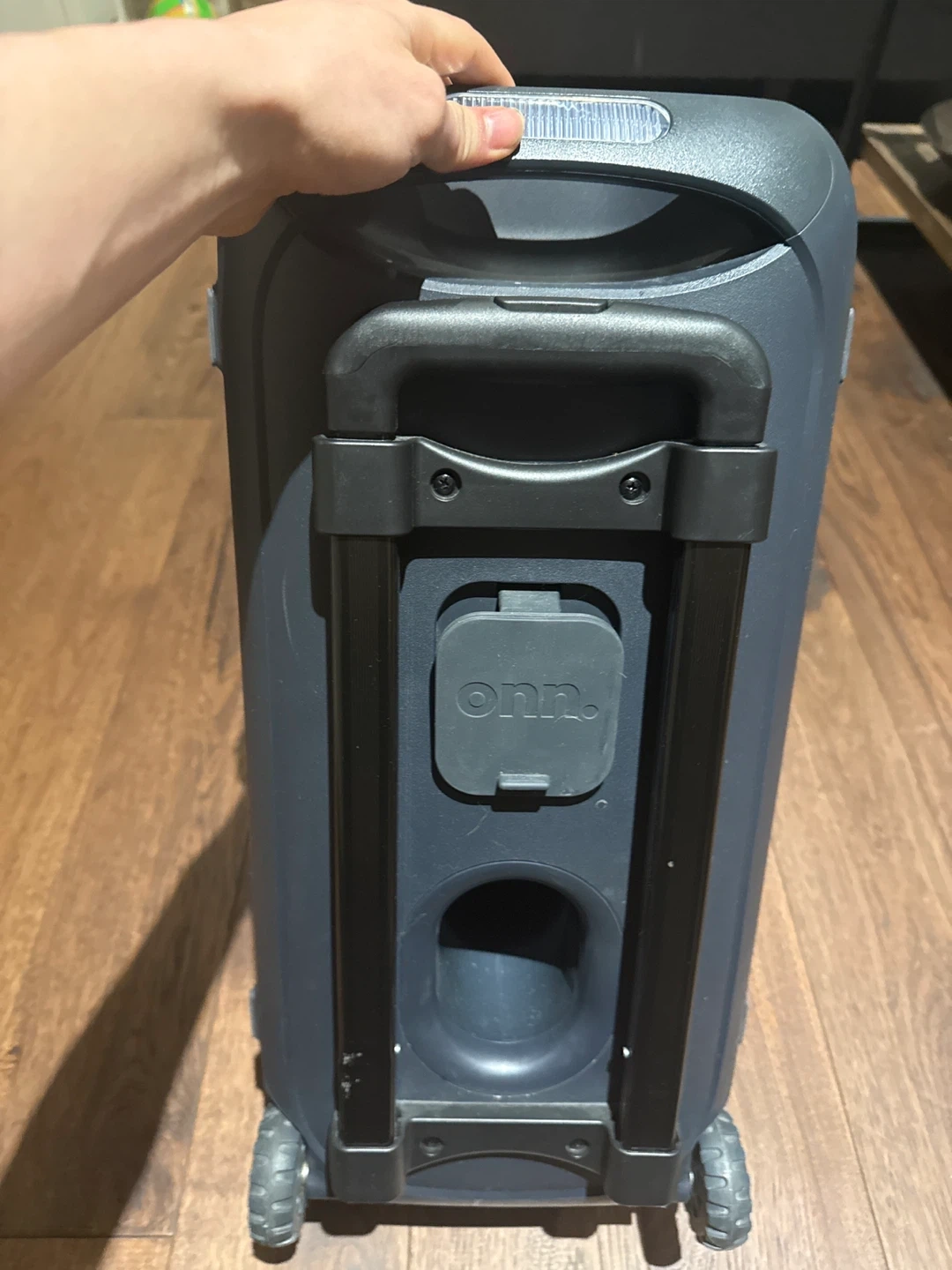 This Onn. portable speaker delivers great sound on the go. It features a built-in handle and wheels for easy transport. Perfect for outdoor gatherings or parties!