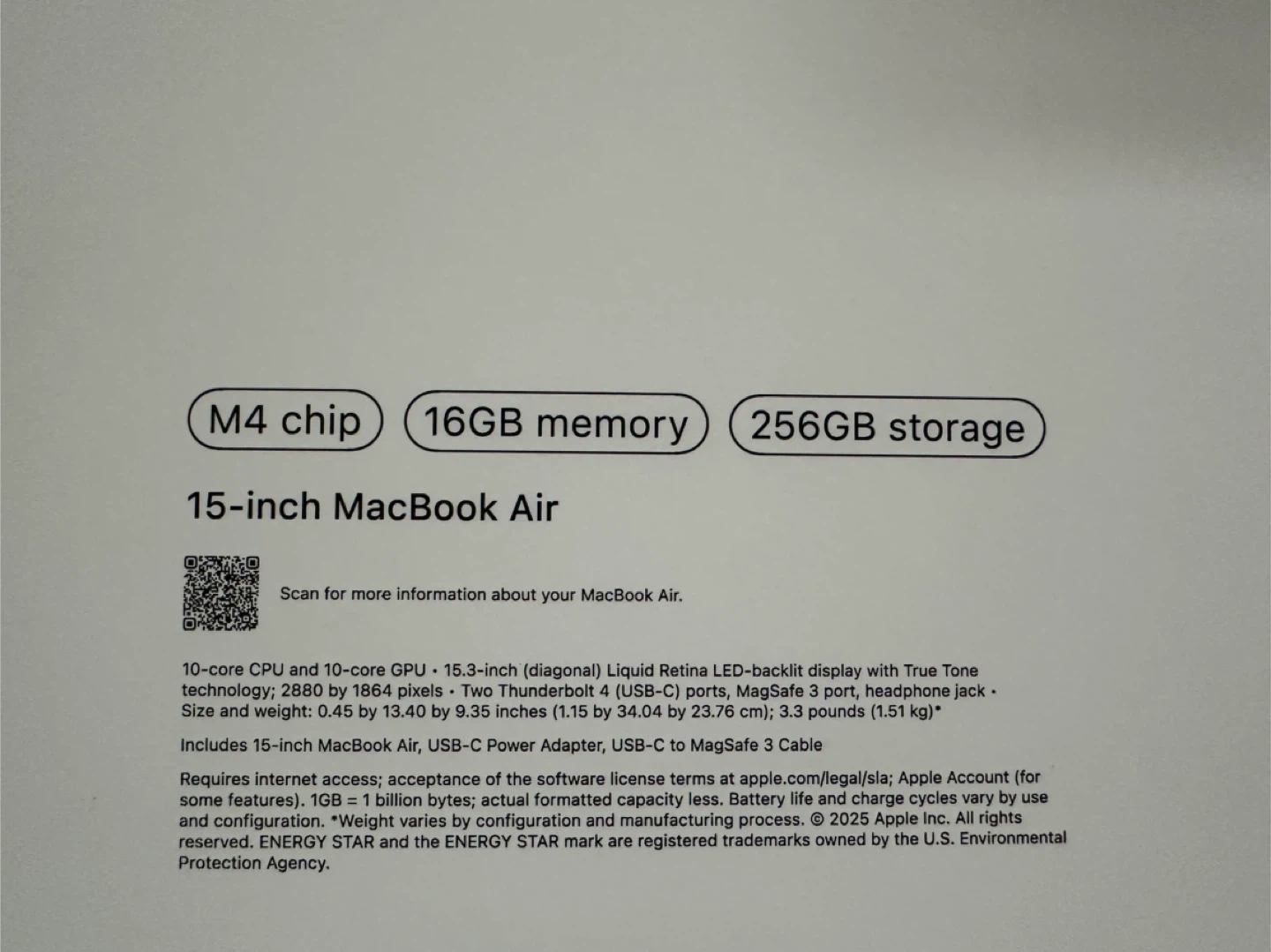 Apple MacBook Air with a 15.3-inch Retina display. It's powered by an M4 chip and has 16GB of memory and 256GB of storage. Includes USB-C Power Adapter and USB-C to MagSafe 3 Cable.
