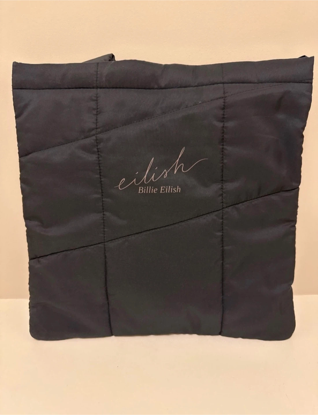 a black quilted tote bag featuring the 'eilish' logo. The book showcases a photo of Billie Eilish on the cover. The tote bag is made of a quilted material.