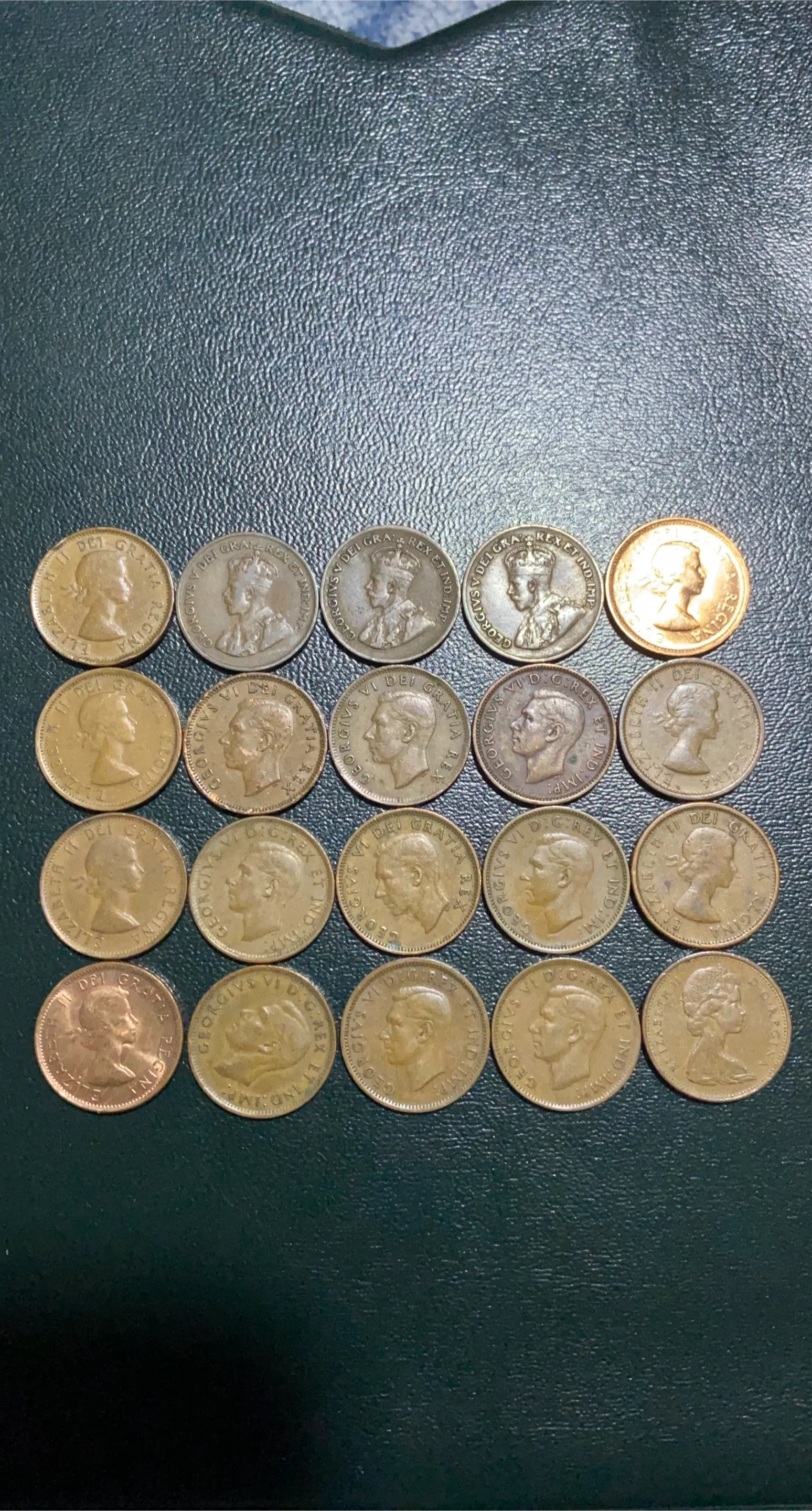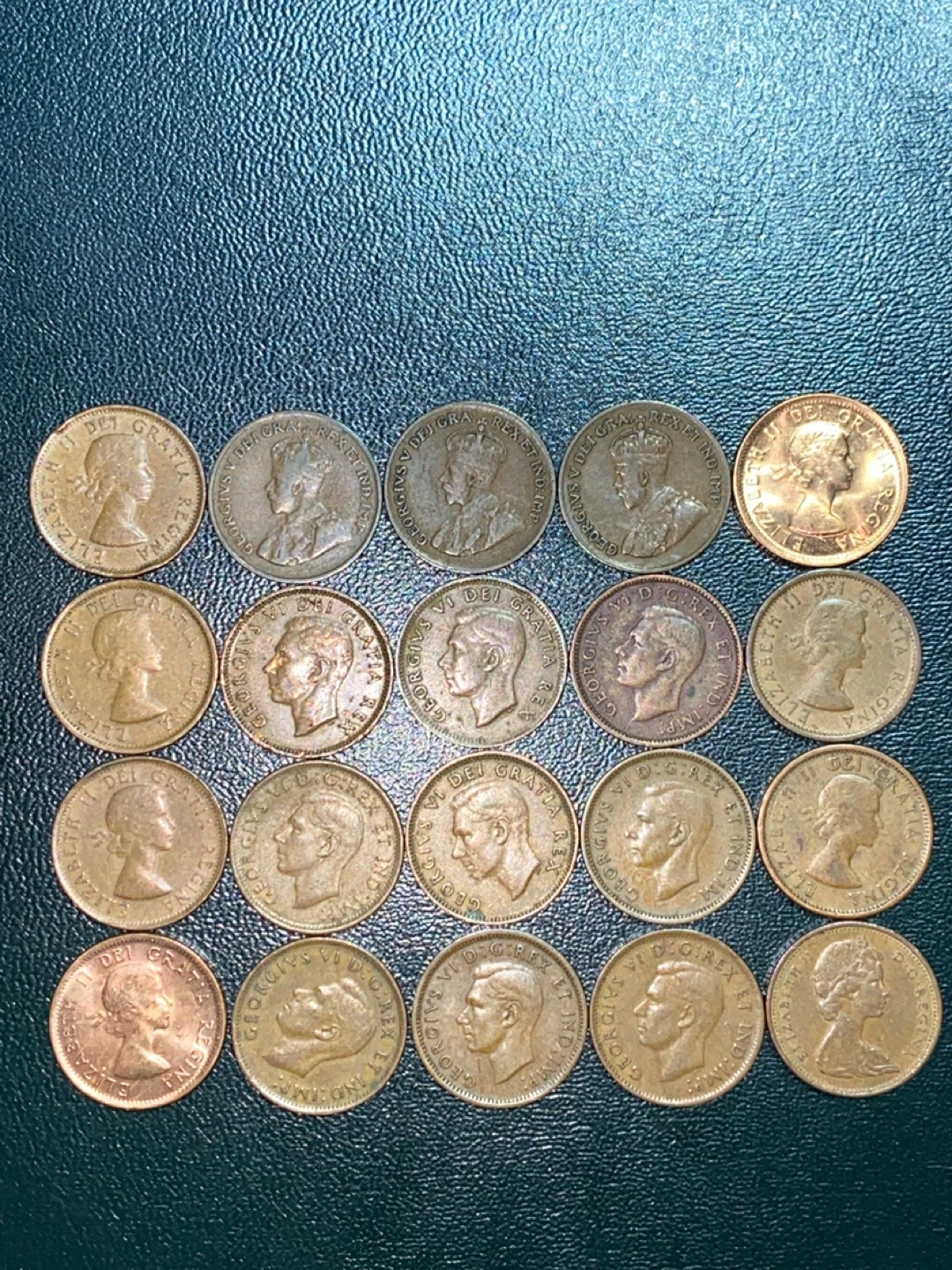 Collection of Canadian one-cent coins, featuring various dates and monarchs. These coins are from Canada's minting history. A great set for collectors!