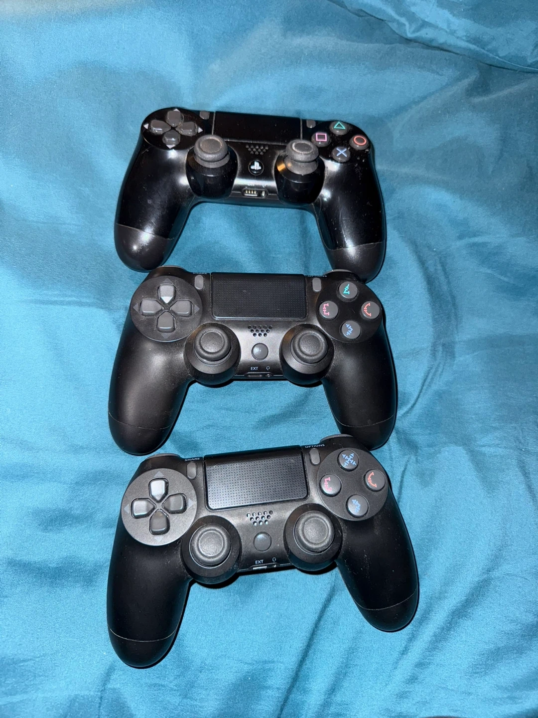 3 PS4 Controllers, Bottom 2 work, 1 works perfectly fine, but the left joysticks on both don’t fully click down but still works fine in games. One of them the right bottom trigger and circle button isn’t working. And the top original controller has a messed up right joystick could be used for parts or fix it, 40$ for all 3.