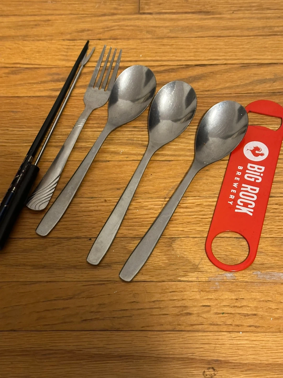 Includes a Big Rock Brewery red bottle opener and three stainless steel spoons and one fork. The bottle opener has some minor scuffs. This set is useful for BBQs or casual get-togethers!