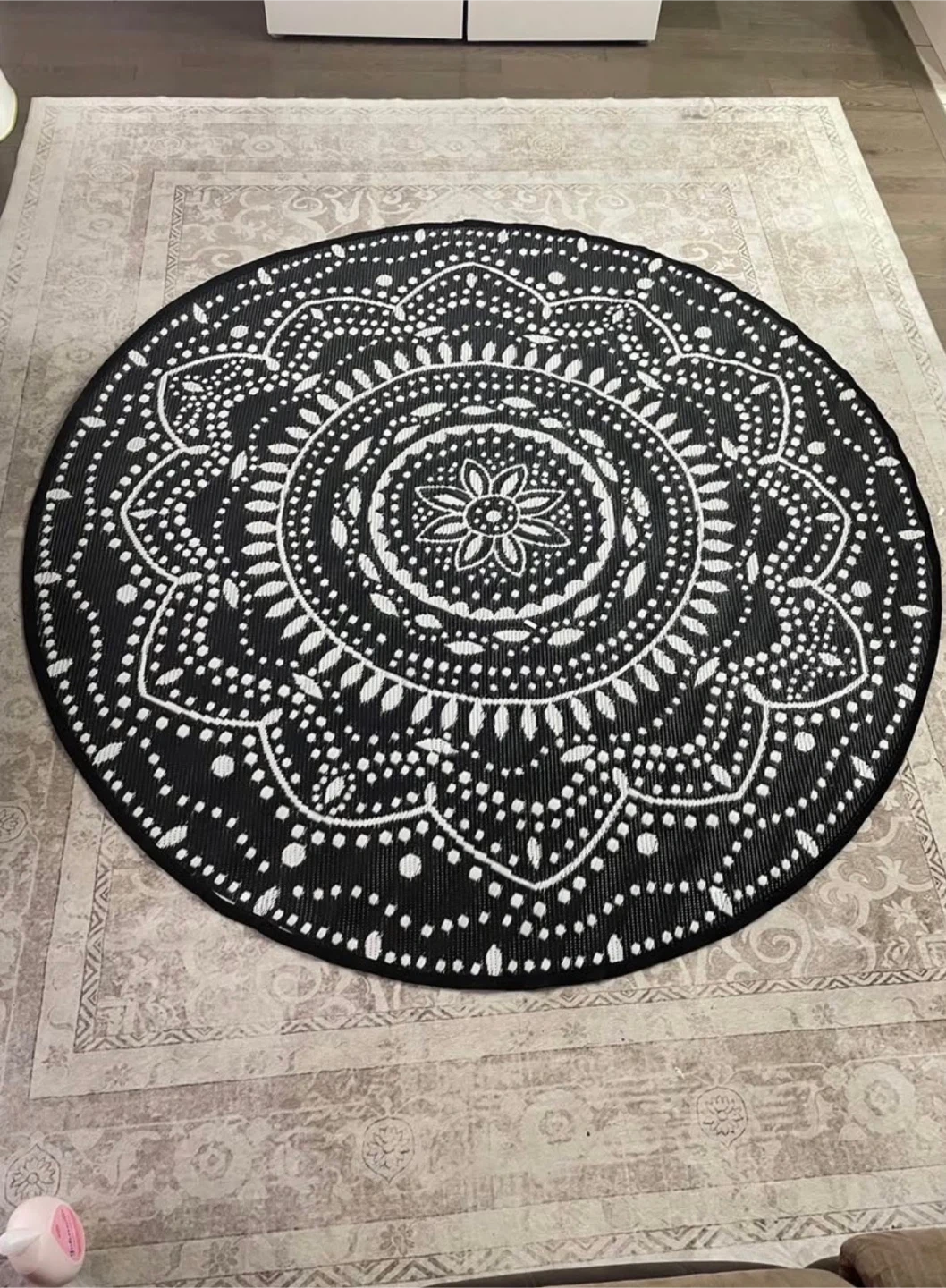 This reversible round area rug features a striking black and white mandala pattern. It's made from durable material that's easy to clean. Perfect for adding a bohemian touch to any room!