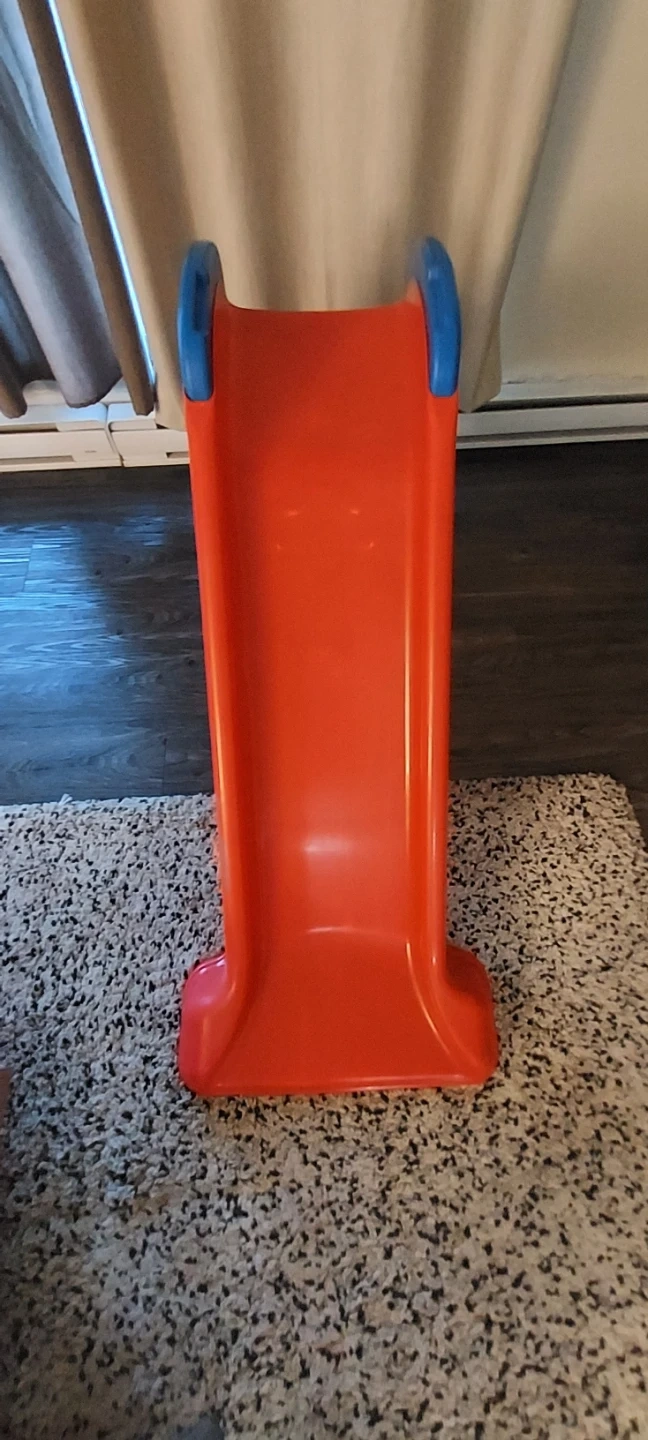 This is a fun red and blue slide for toddlers. It's made of durable plastic and perfect for indoor or outdoor play. It's easy to assemble and clean. This slide is great for little ones developing coordination and balance!