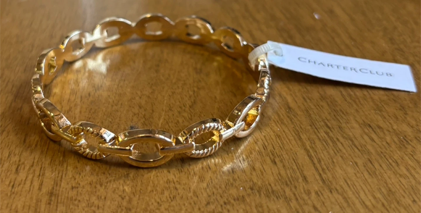 This is a Charter Club gold tone link bracelet. It features an oval link design with textured accents. It's a stylish accessory that adds a touch of elegance to any outfit. This bracelet could be a nice addition to your jewelry collection!