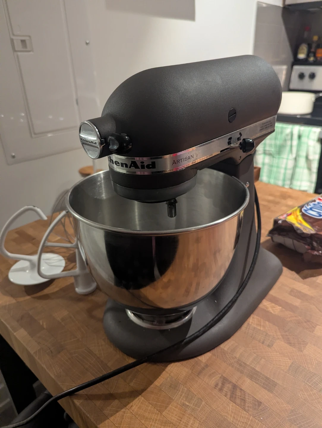 This is a matte grey KitchenAid Artisan stand mixer. It comes with a wire whisk and a flat beater attachment. It features 10 speed settings and has a max wattage of 325. This mixer is great for all your baking needs!