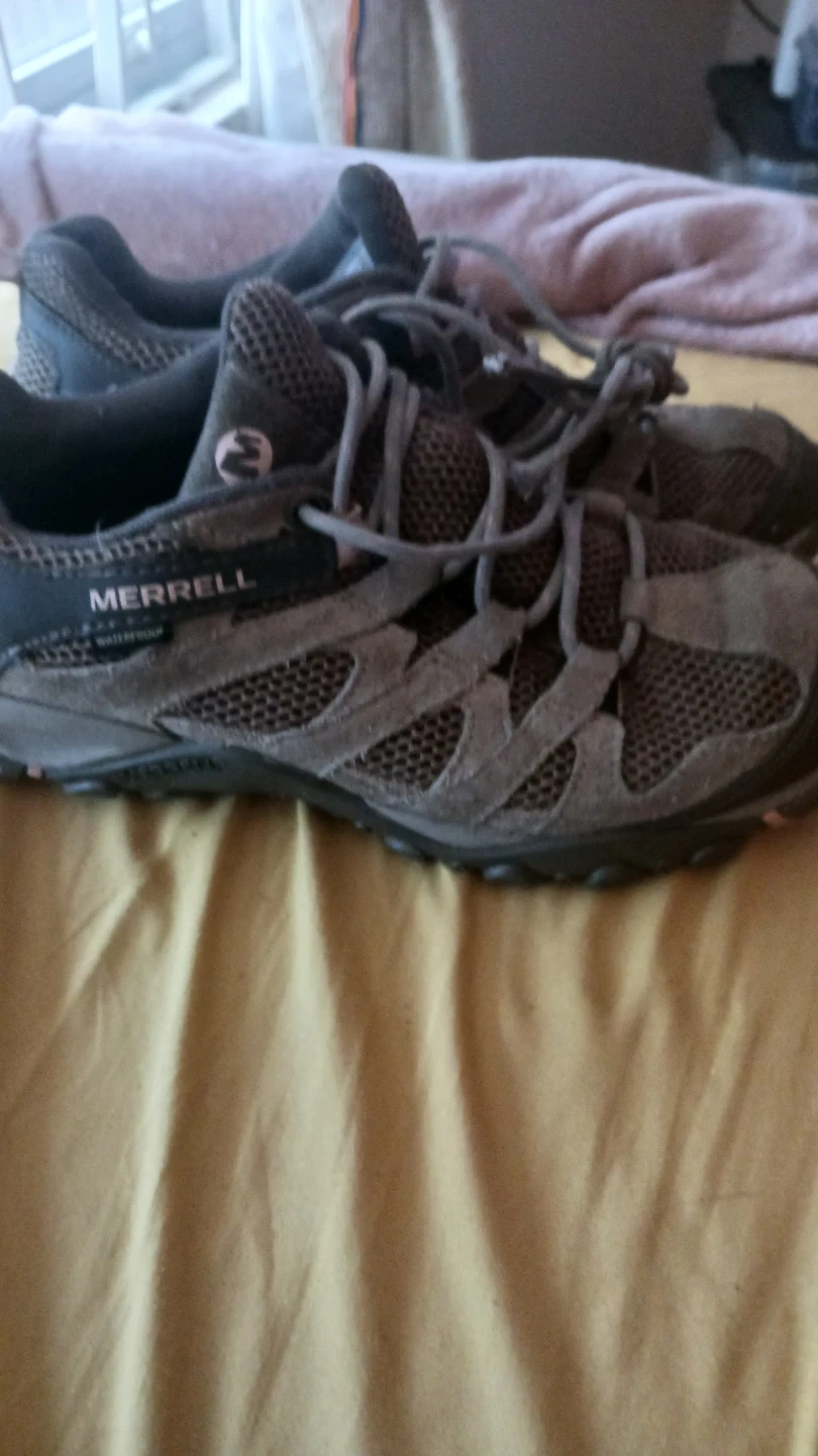 These Merrell hiking shoes are grey and feature a lace-up closure. They're made with mesh and suede materials for durability and breathability. The sole has good grip for trails. Available in women's size 8. Heavy-duty leather structure and substantial rubber sole!