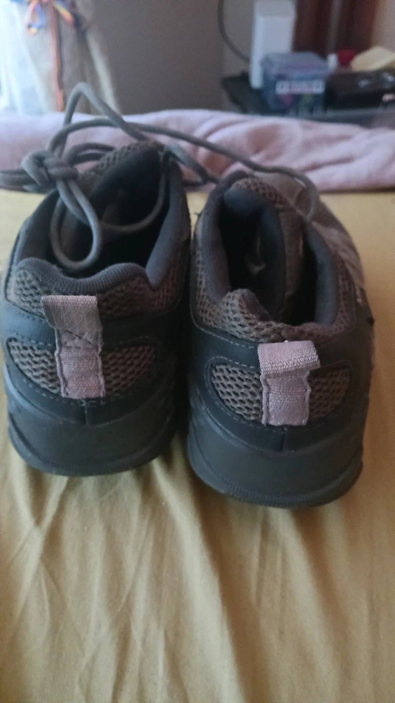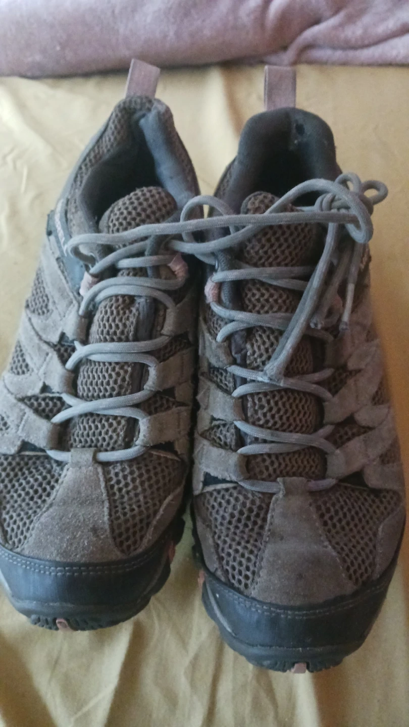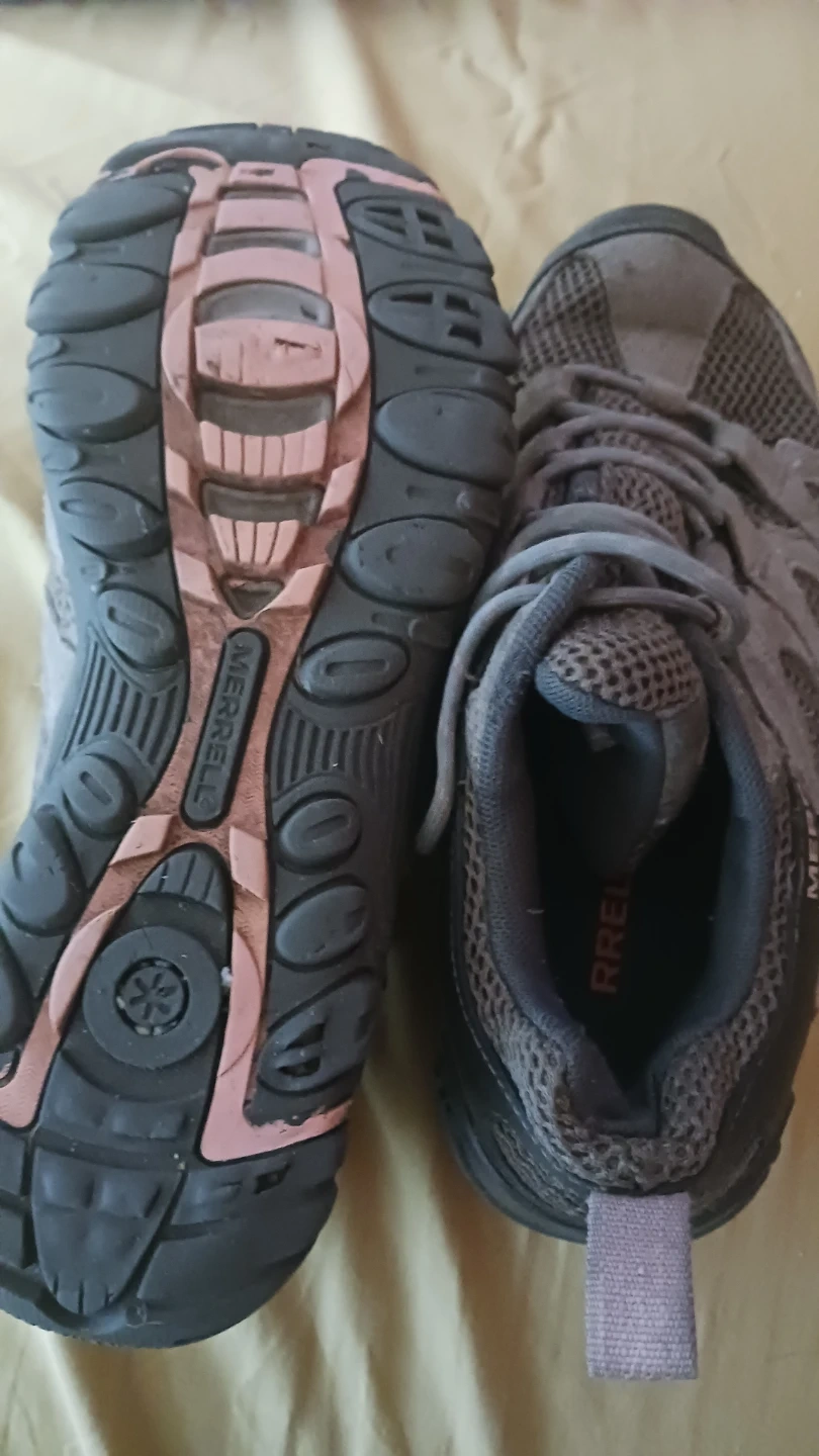 These Merrell hiking shoes are grey and feature a lace-up closure. They're made with mesh and suede materials for durability and breathability. The sole has good grip for trails. Available in women's size 8. Heavy-duty leather structure and substantial rubber sole!