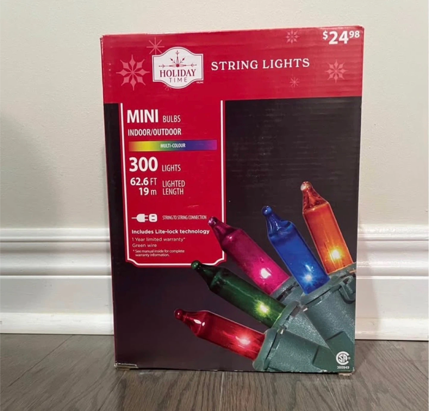 Brand new lighting featuring 300 multi-colour bulbs. They're for indoor or outdoor use and have a 62.6 ft lighted length. Lite-lock technology is included.