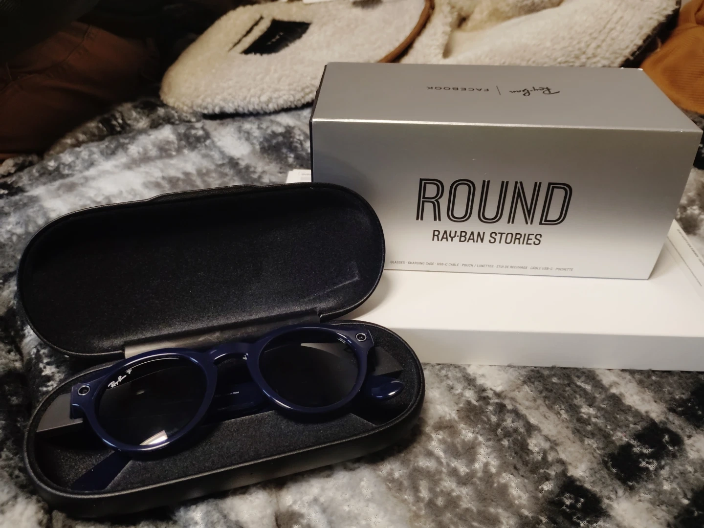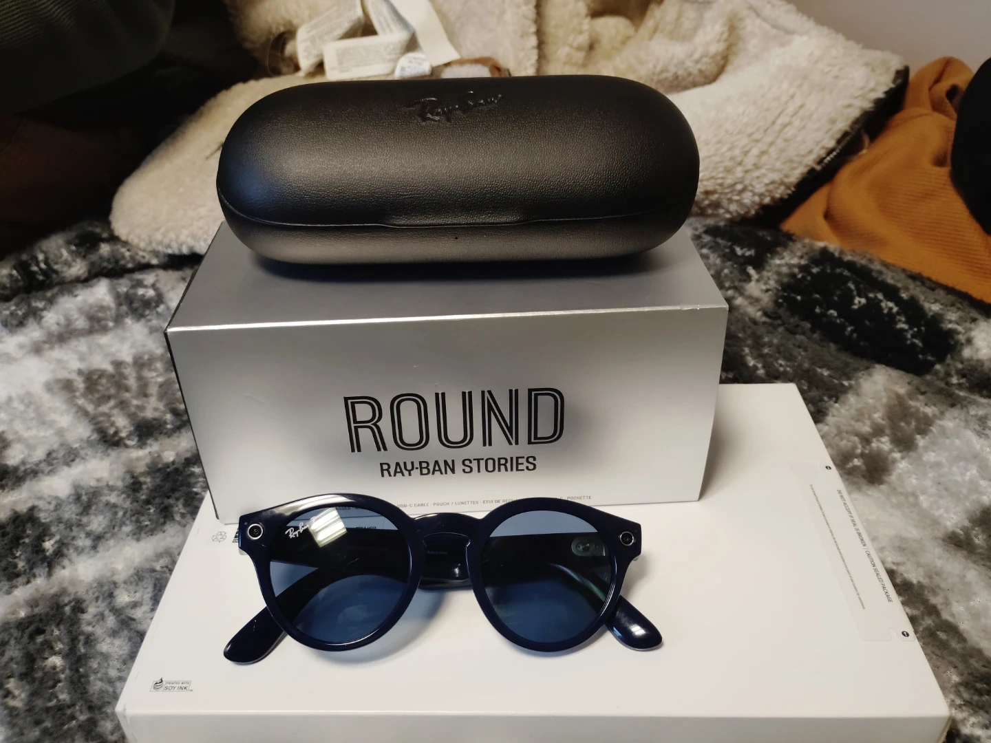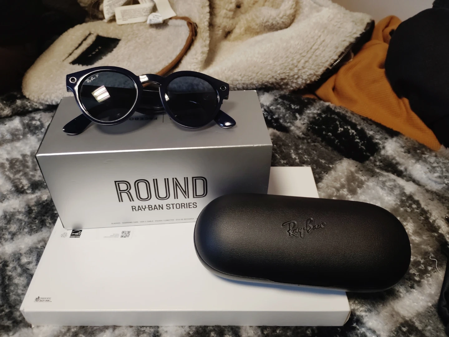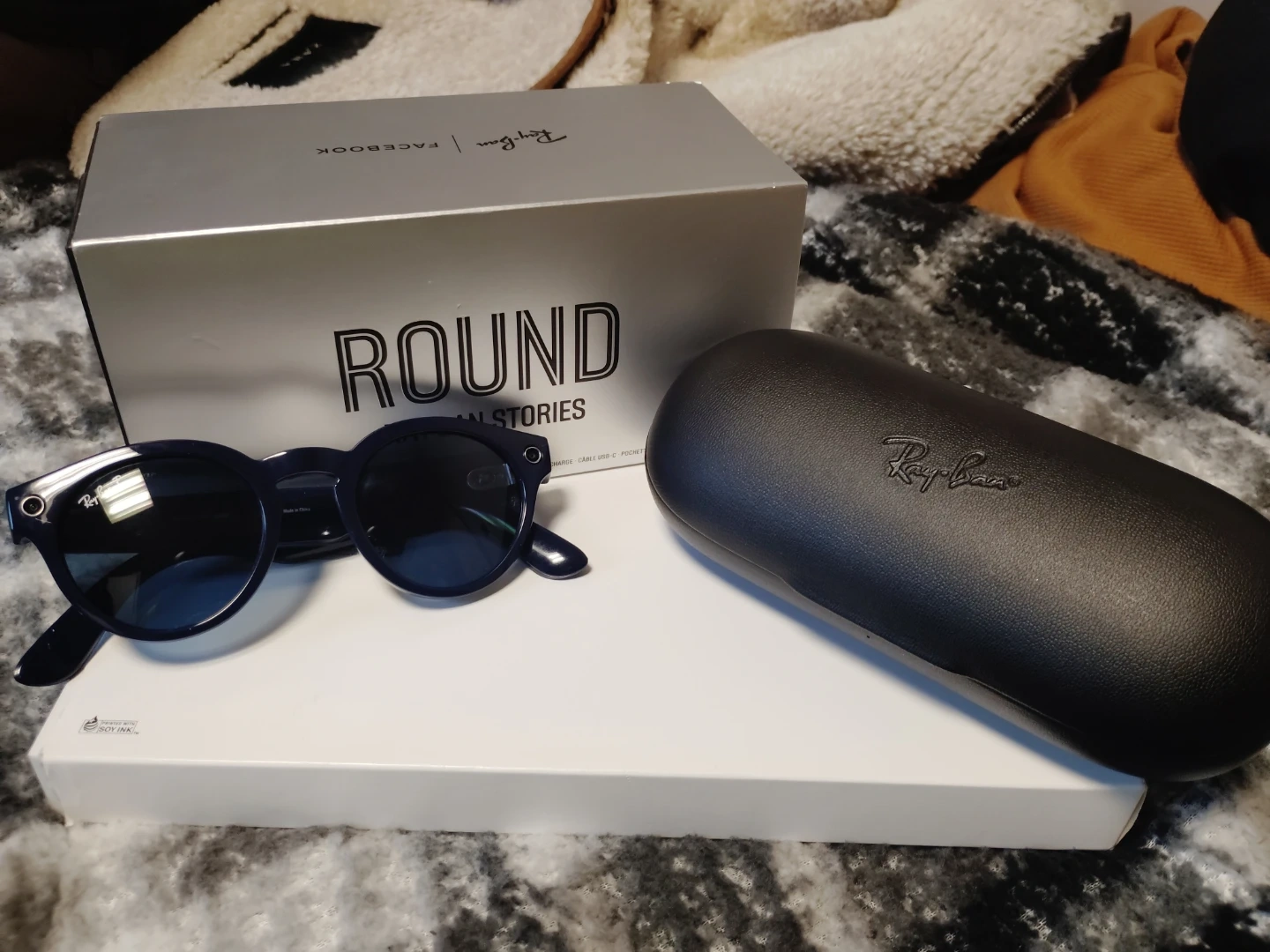 Ray-Ban Stories Round smart sunglasses. Features built-in camera and speaker. Includes charging case and original packaging.