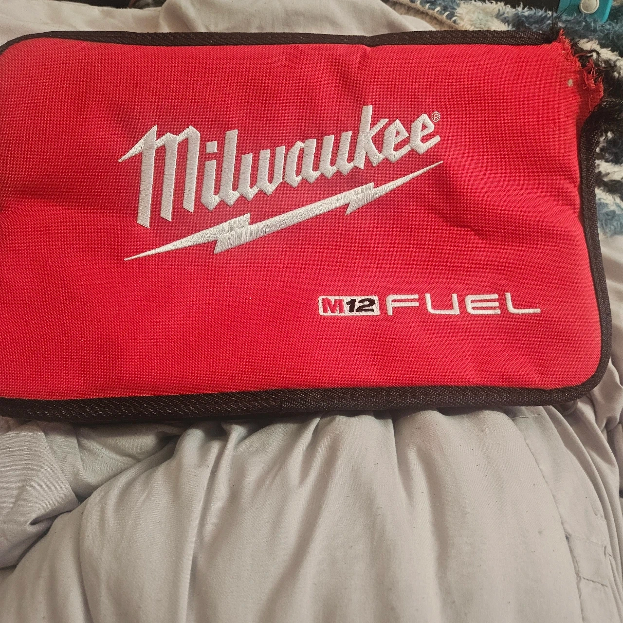 Includes a Milwaukee M12 FUEL cordless drill and impact driver. Both are red and black. Comes in a red carrying case with a black interior. With battery's and charger