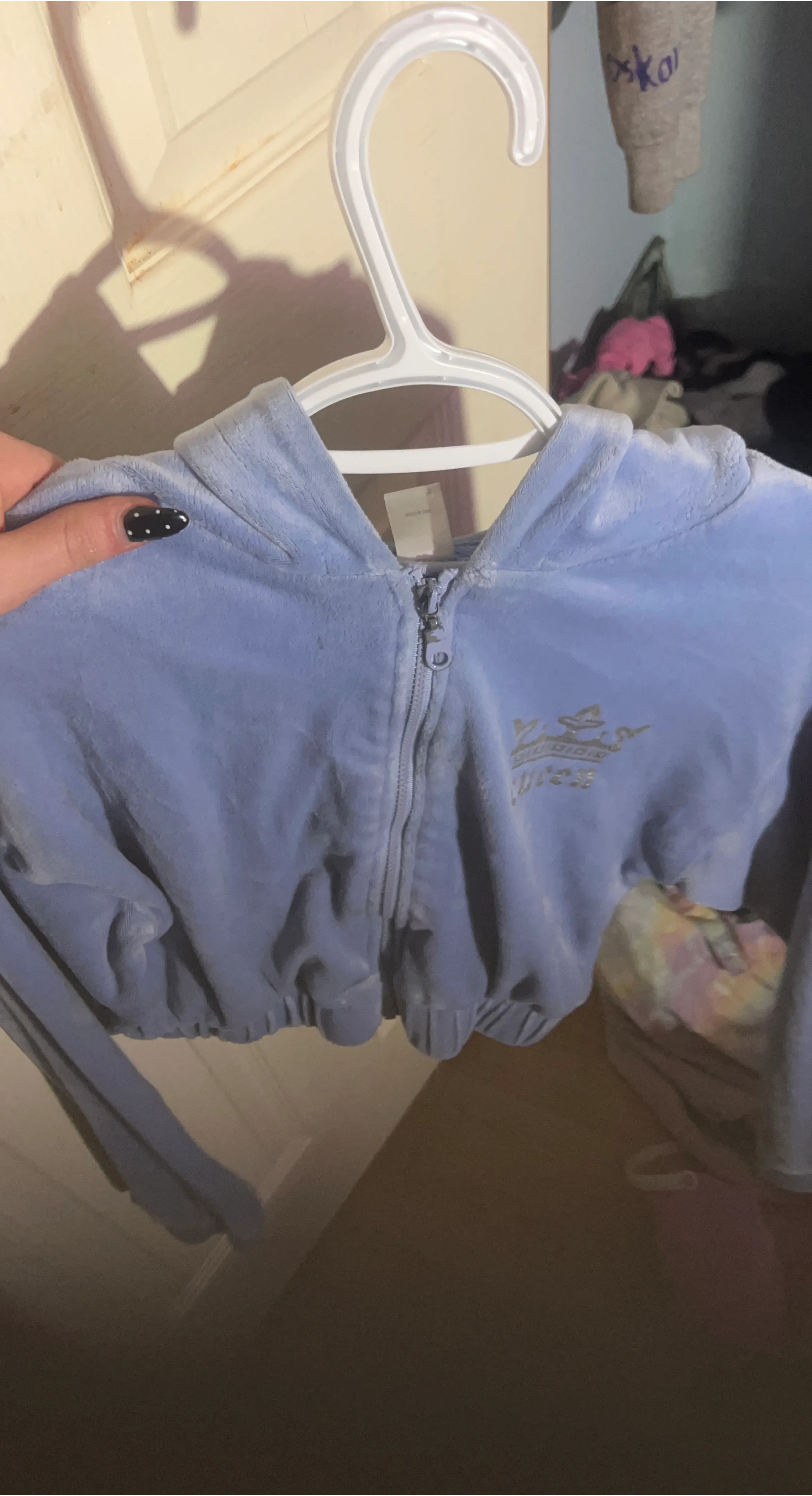 Juicy Couture velour zip-up hoodie in a light blue colour. It's a cropped style with a full-zip closure and a hooded neck. The front features a gold embroidered logo with a crown and the word "Juicy".