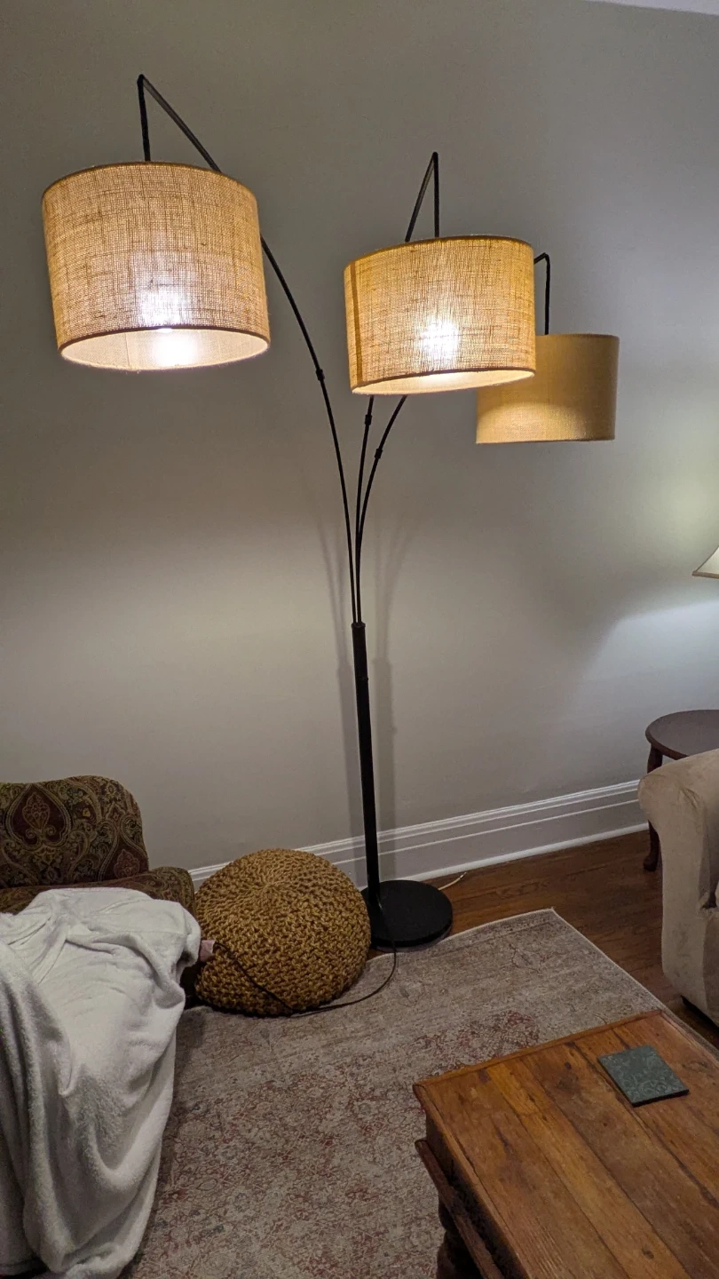 This arc floor lamp has three drum-shaped fabric shades. The shades are a natural beige colour. It's a great way to add ambient lighting to your living space.