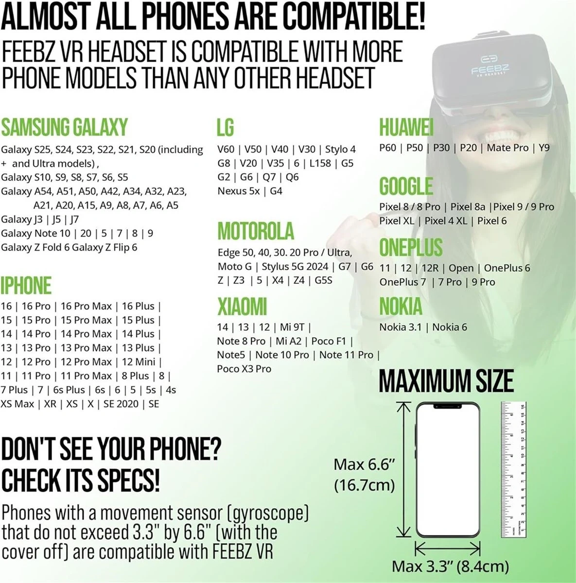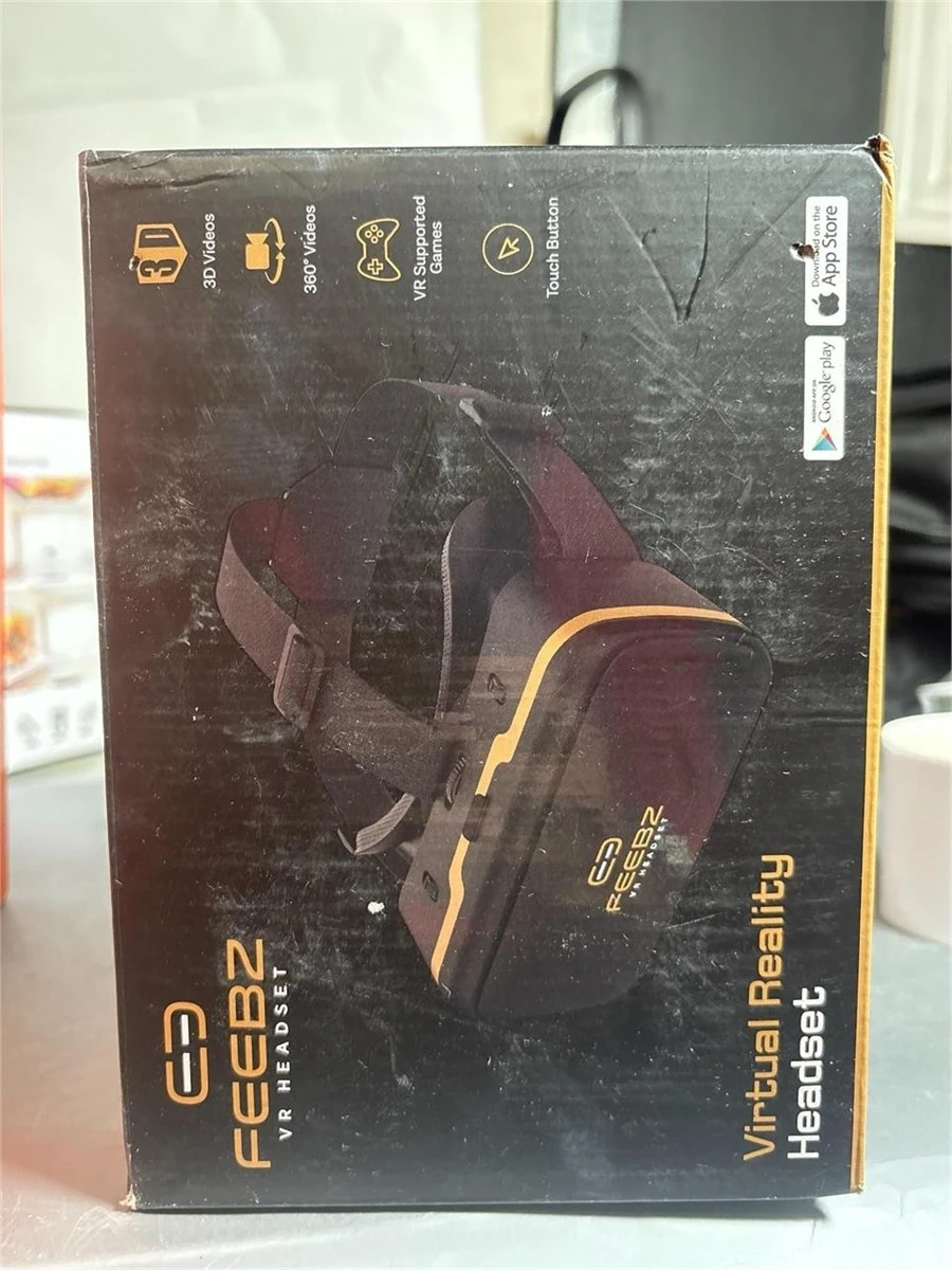 This is a FEEBZ VR headset compatible with most smartphones, up to 6.6" x 3.3". It comes with a remote and the original box, offering access to VR games and videos. This headset is suitable for experiencing virtual reality content.