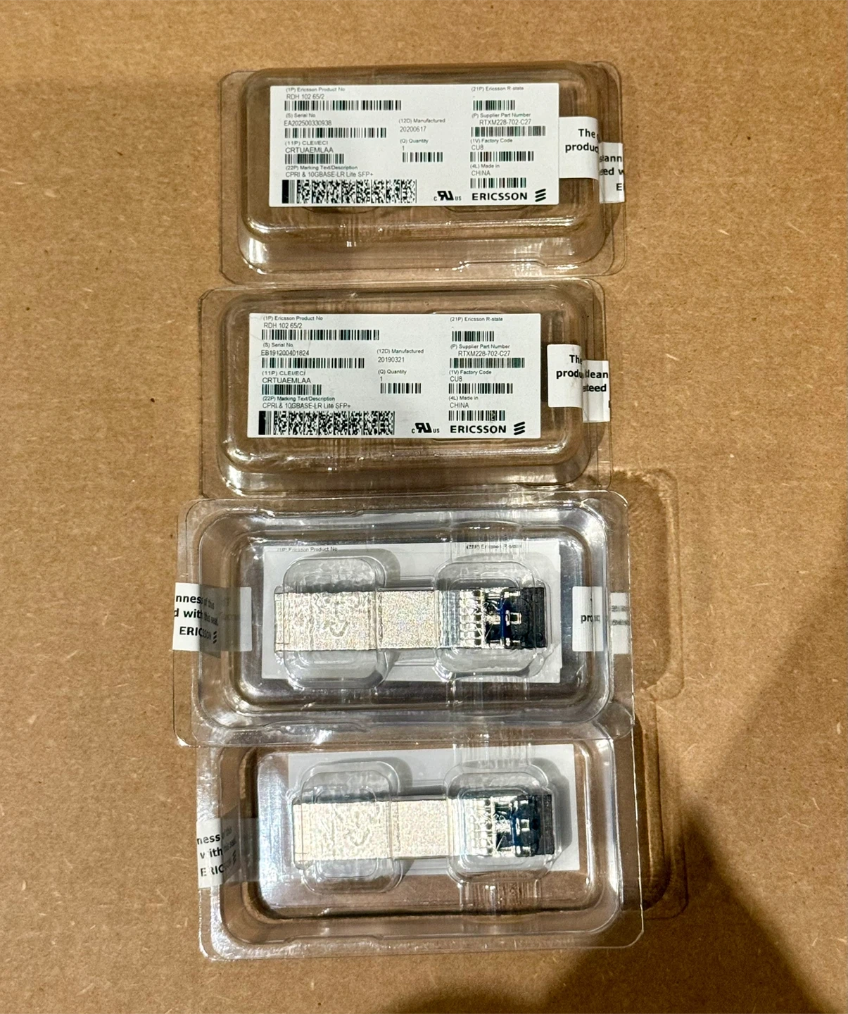Lot of 5 Ericsson CPRI & 10GBASE-LR Lite SFP+ network transceivers. Each unit is an Ericsson product, model RDH 102 65/2. These are new items, still in original packaging.