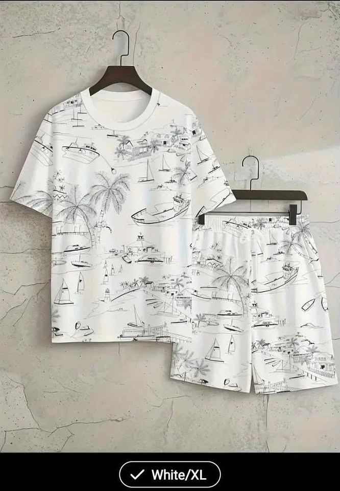 Men's fashion casual 3D print short sleeve shirt and shorts set. Features a round neck, regular fit, 100% polyester knit fabric with slight stretch. Located near Lakeshore and Thirteenth Street.
