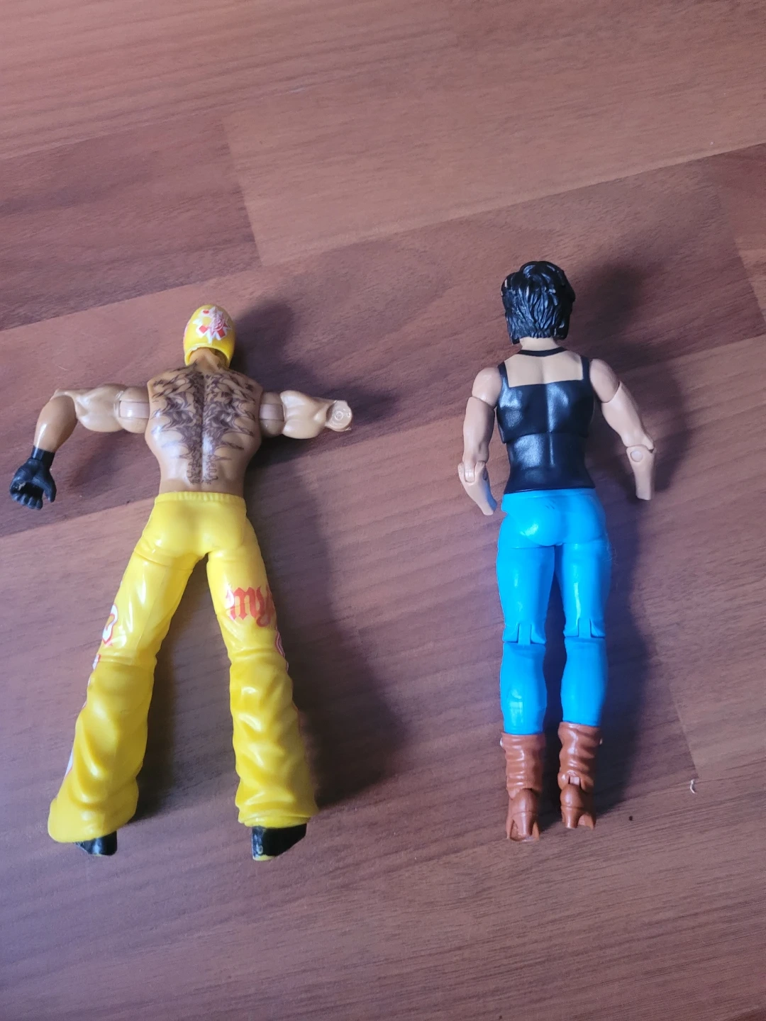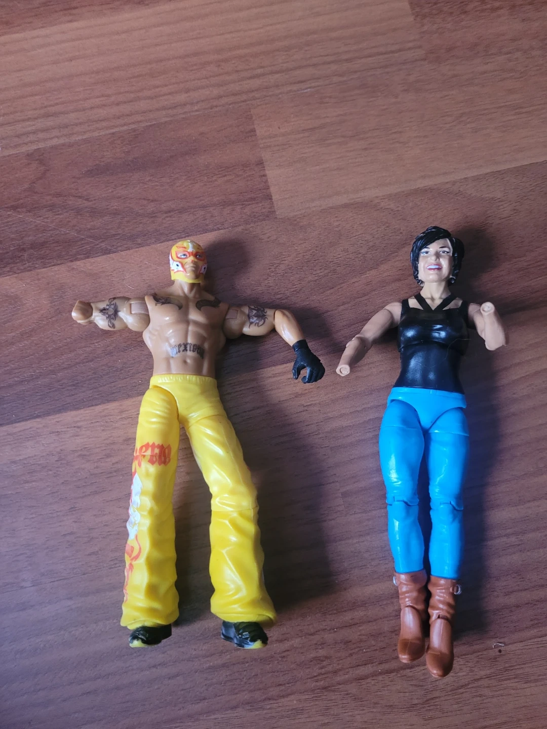 I am selling 2 used WWE action figures, including a Rey Mysterio and one other figure. Please see the photos for details on condition, including a missing arm and hands. They hit the ring hardcore , before purchasing
