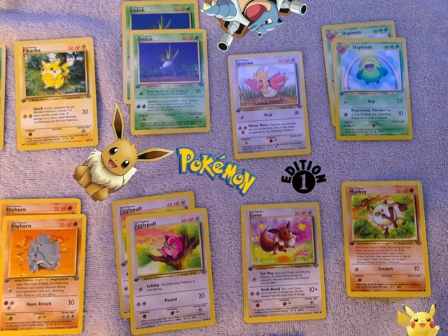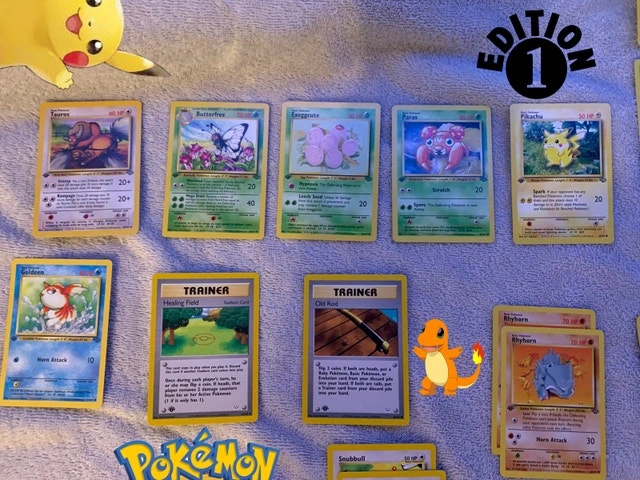 I'm offering a selection of 1st edition Pokemon cards from the early sets! These cards are in NEAR MINT condition, so please see the photos for details. A great opportunity to add to your collection or start a new one! These cards have been kept in a binder for safe keeping since opening. Why did Pikachu blush? Because he saw Charizard flexing! If the ad is up, yes, it's still available!