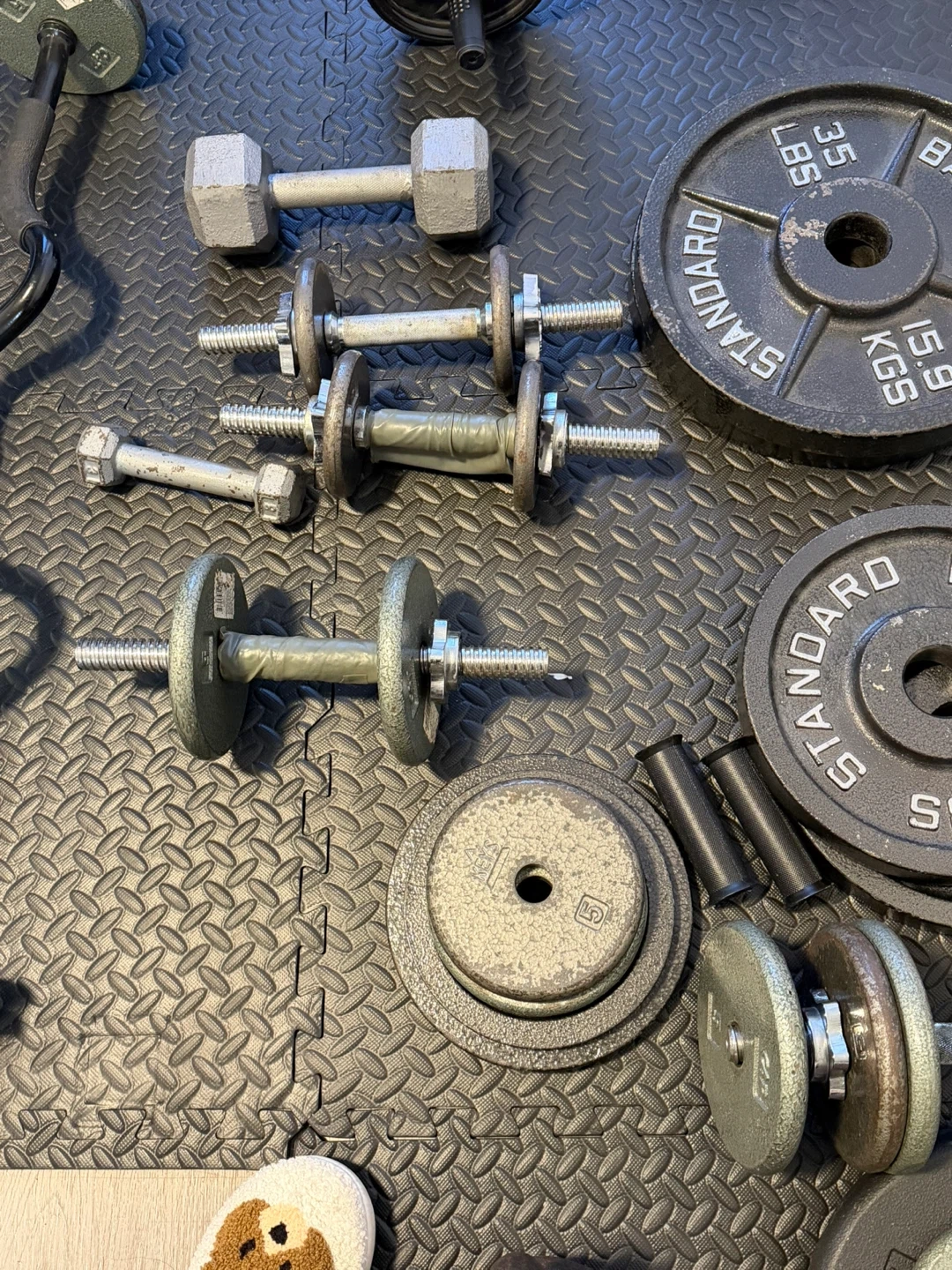 Complete home gym setup including a power rack with bench, assorted standard weight plates and dumbbells, a curl bar, and a kettlebell. This collection offers a versatile range of equipment for strength training workouts. Great for building your own fitness space at home!