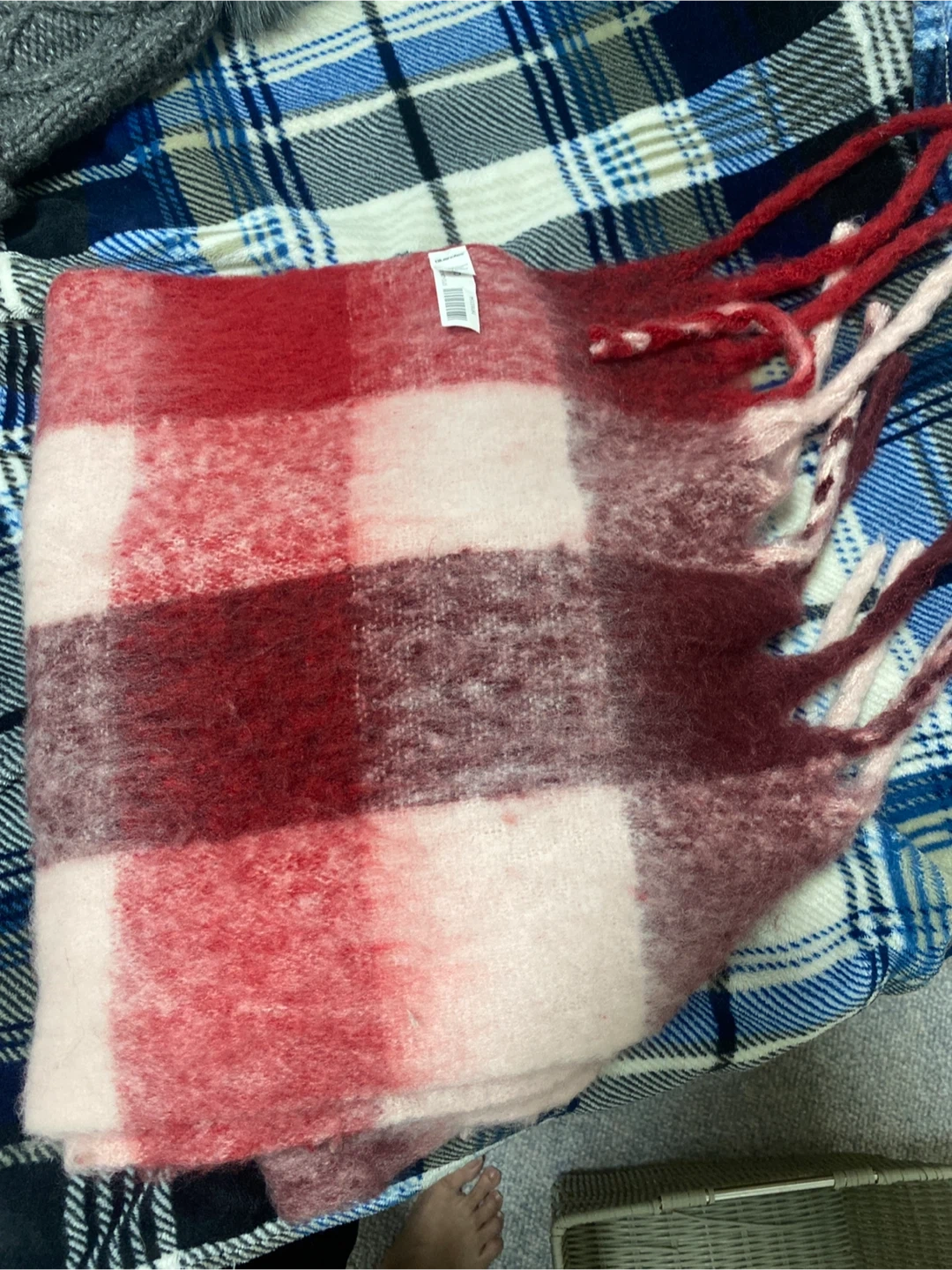 Cozy plaid blanket scarf. It's a soft, fuzzy material in red, white, and maroon. Measures approximately 180cm x 50cm. Perfect for keeping warm on chilly days! Pick up cash only