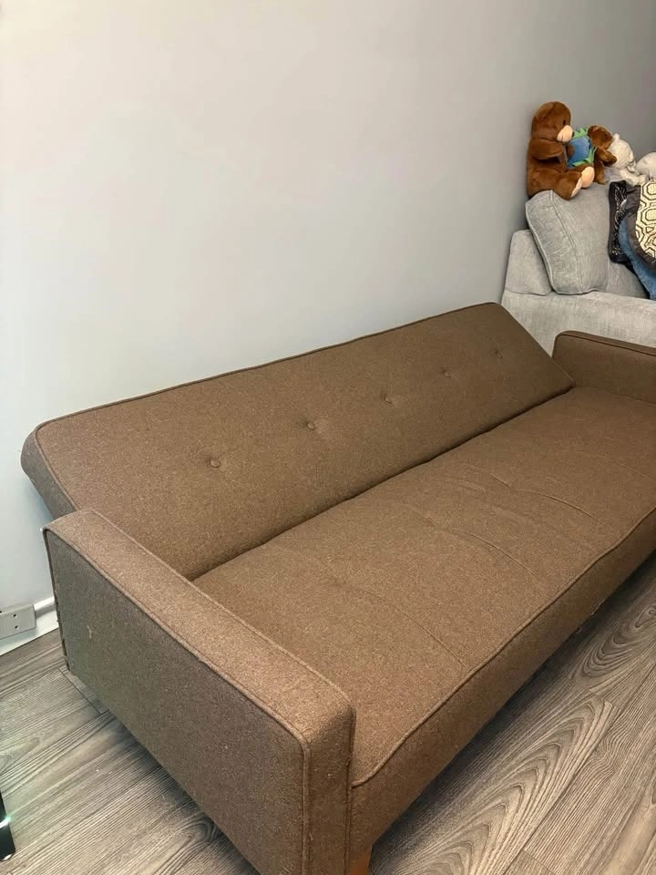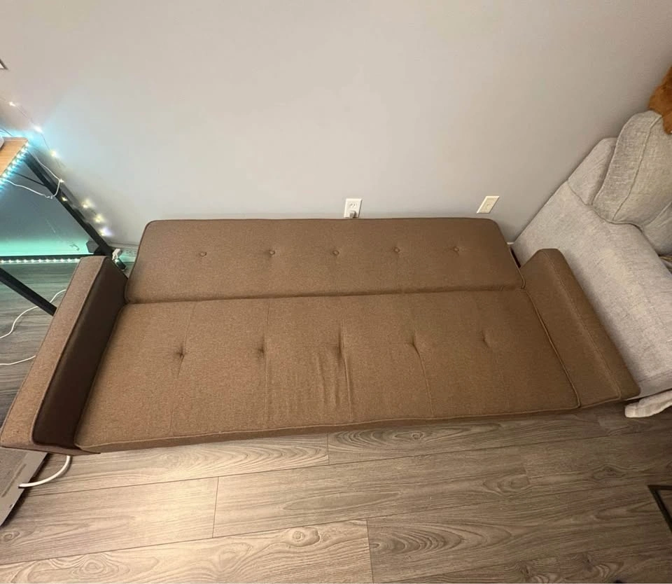 Selling a brown couch that reclines into 3 positions (sofa, 45 degrees, and flat bed). In good condition, it was always used with a cover. It does have some small scratches from cats, but no big defects or tears. Dimensions: Length 74 inches, Height 27 inches, Width 32.5 inches (couch) and about 38 inches (reclined). Pick up only, will need assistance to carry it out.