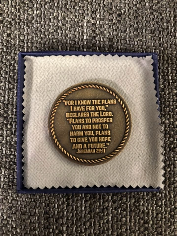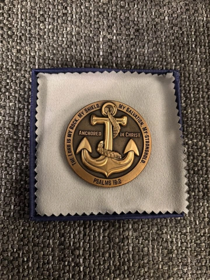 Antique gold plated hand made Anchored in Christ challenge coin. Features an anchor motif on the front and Jeremiah 29:11 on the reverse. Brand new, never removed from its blue gift box except for photos. Includes a cleaning cloth and written explanation. A perfect gift for the Christian in your life who wants to celebrate Christ and be reminded they are anchored in his love.