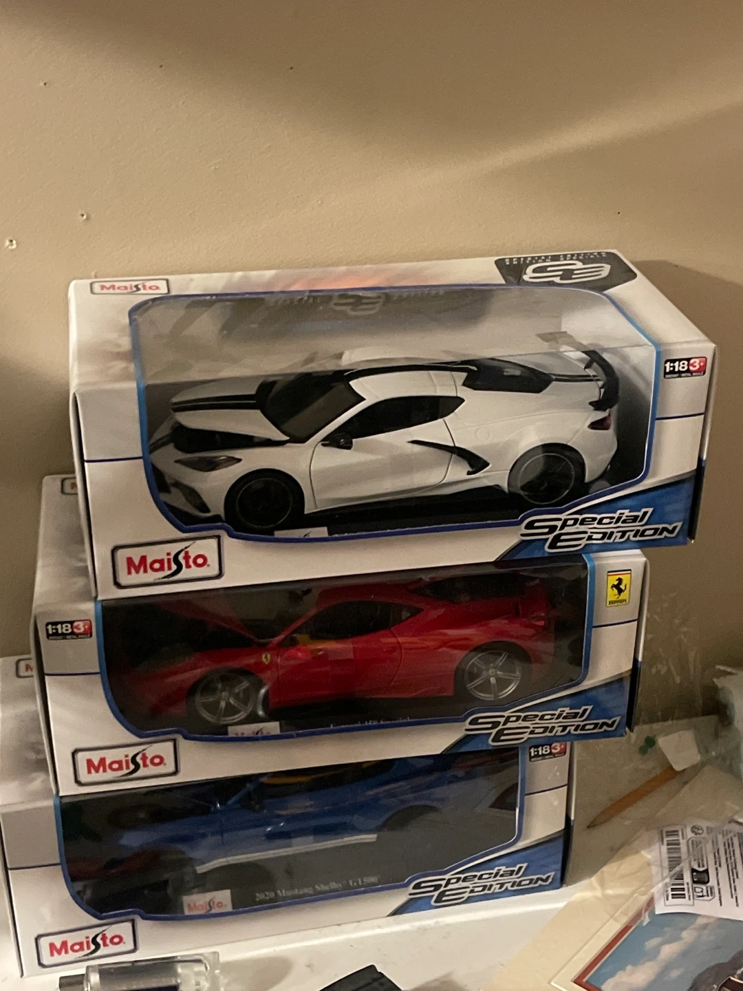 Collection of Maisto Special Edition 1:18 scale die-cast model cars. Includes Ferrari 458 Speciale, 2020 Corvette Stingray Coupe, and 2020 Mustang Shelby gt500