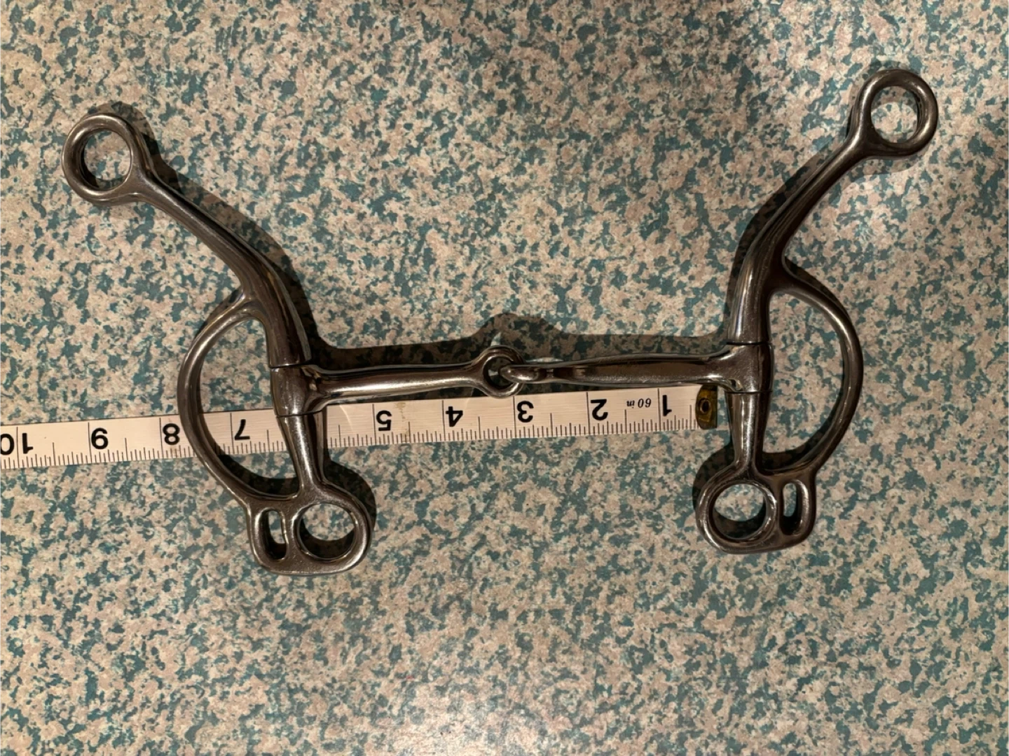 This is a metal horse bit, likely for training or riding. It measures approximately 5.5 inches from cheek to cheek. It's a single jointed design with rings for reins.