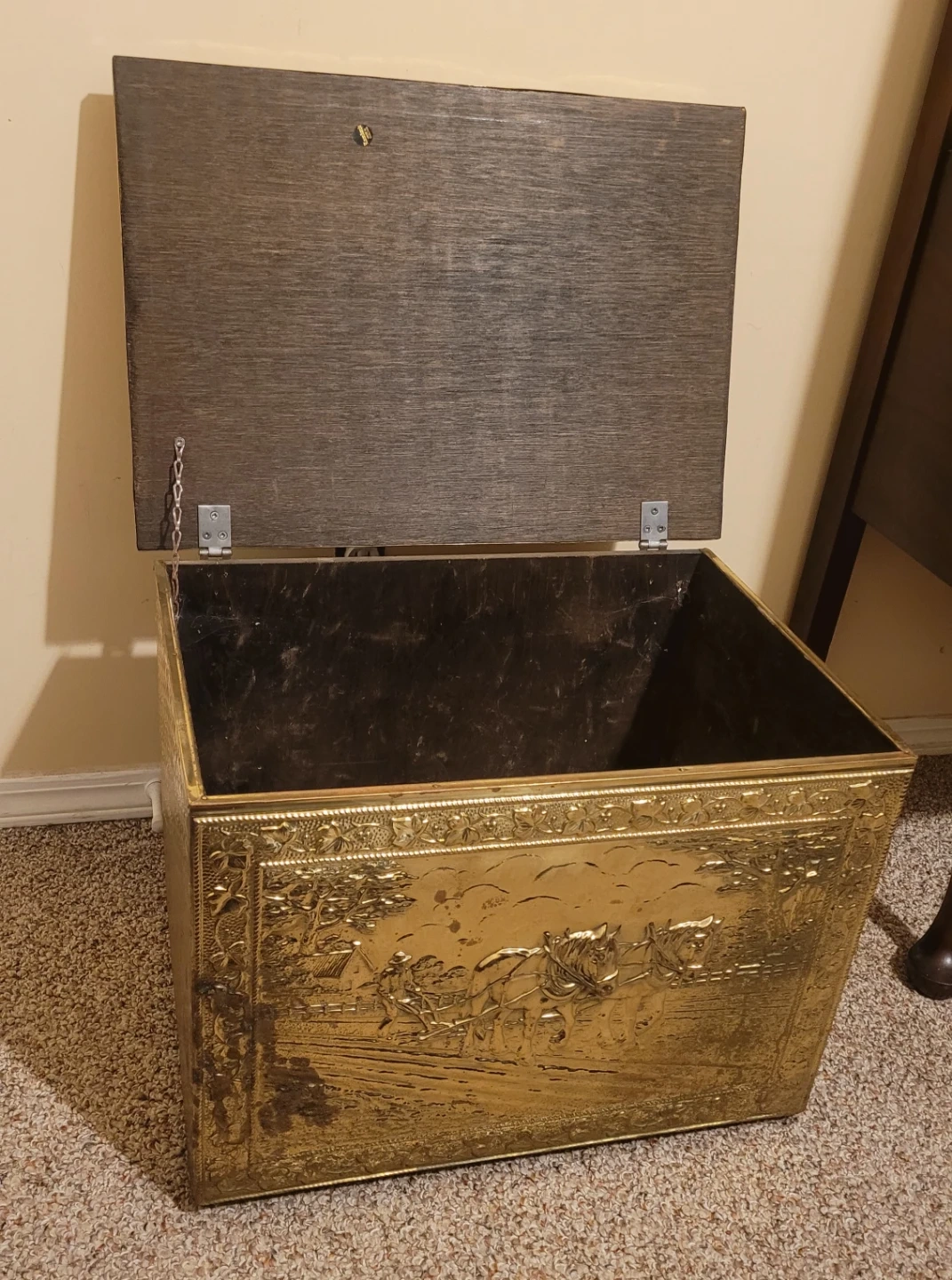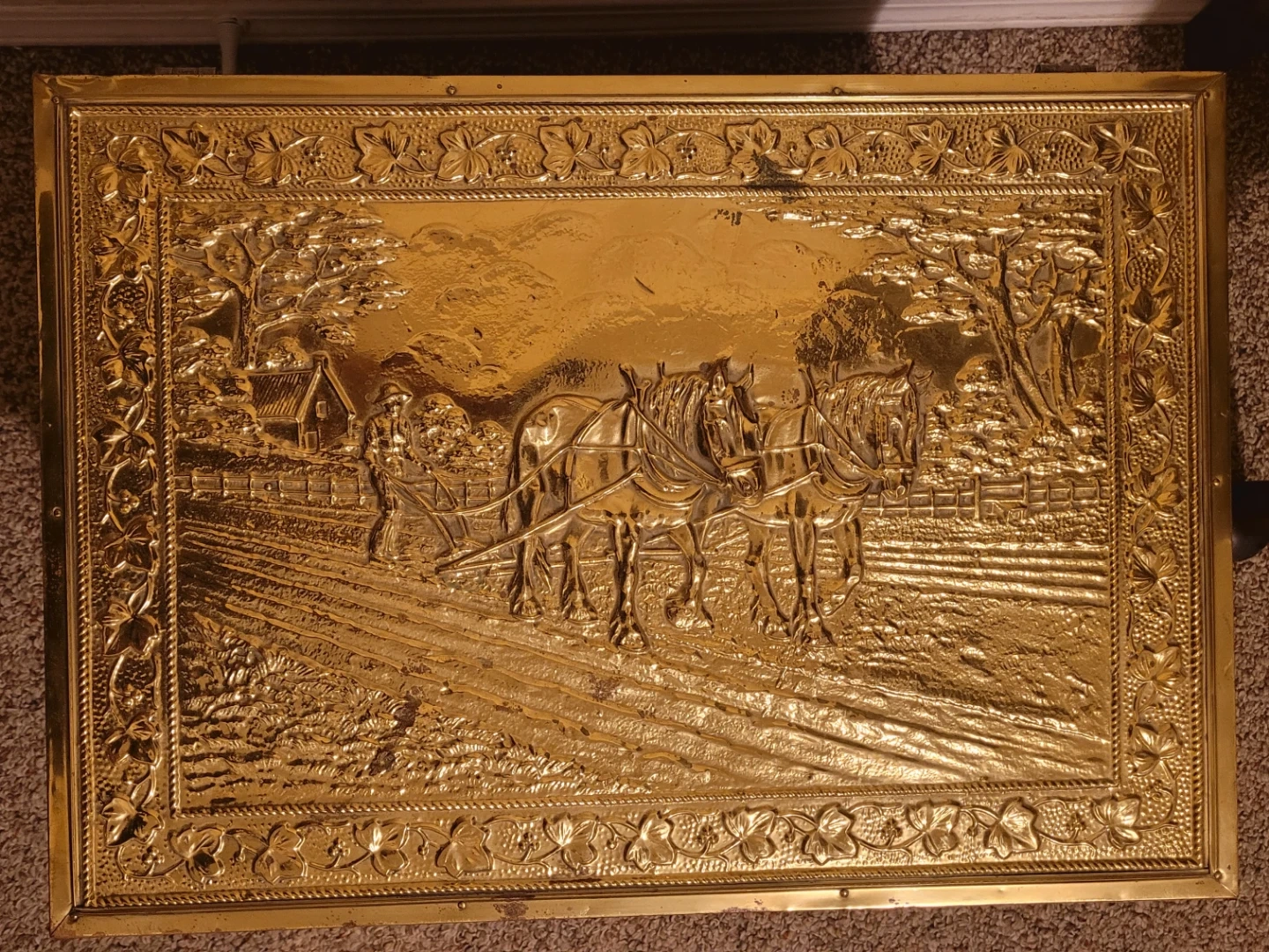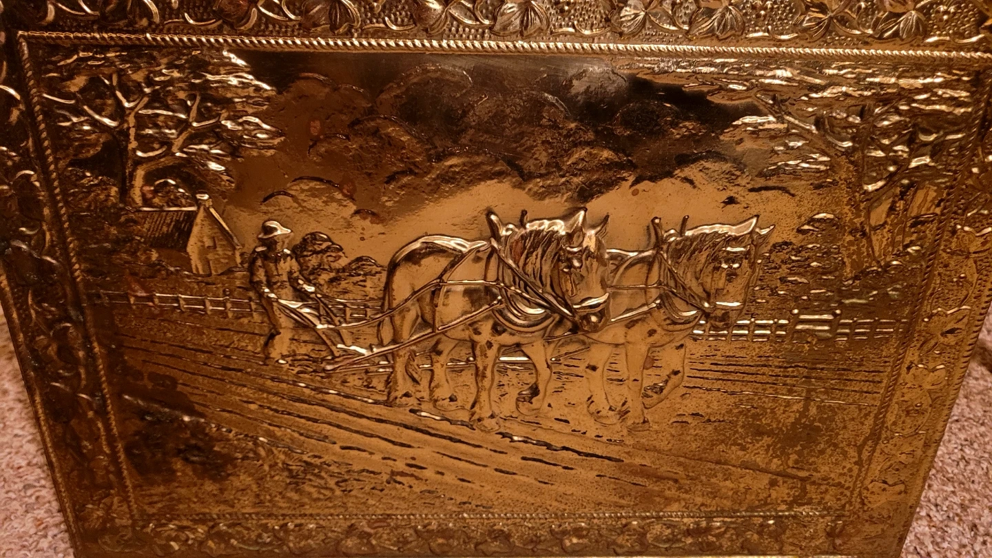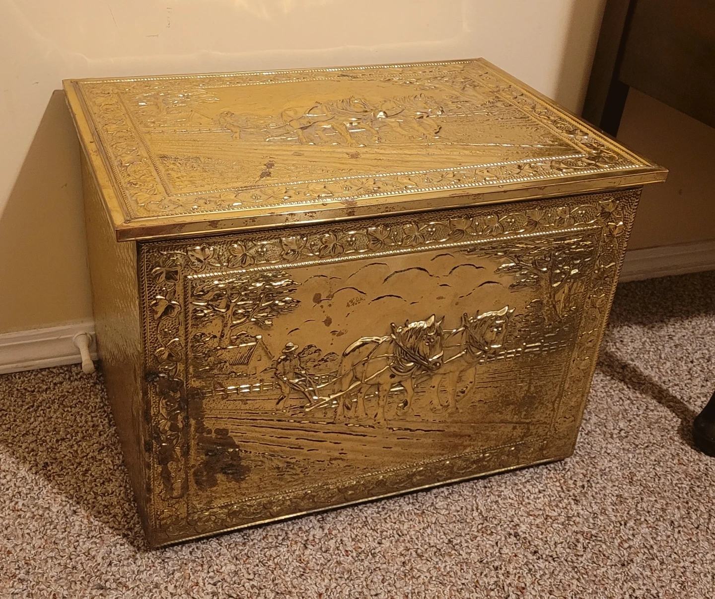 Beautiful brass plated kindling chest. Could use a polish in a couple places but overall the brass looks pretty good. Portrays a farmer plowing his fields with two horses on the top and front.