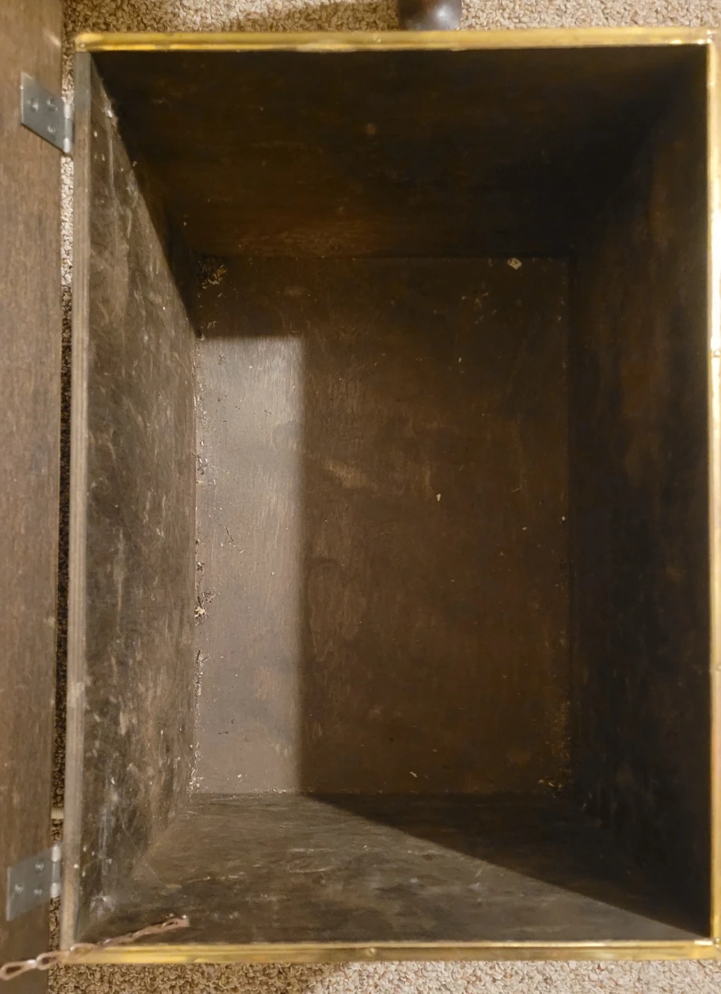 Beautiful brass plated kindling chest. Could use a polish in a couple places but overall the brass looks pretty good. Portrays a farmer plowing his fields with two horses on the top and front.