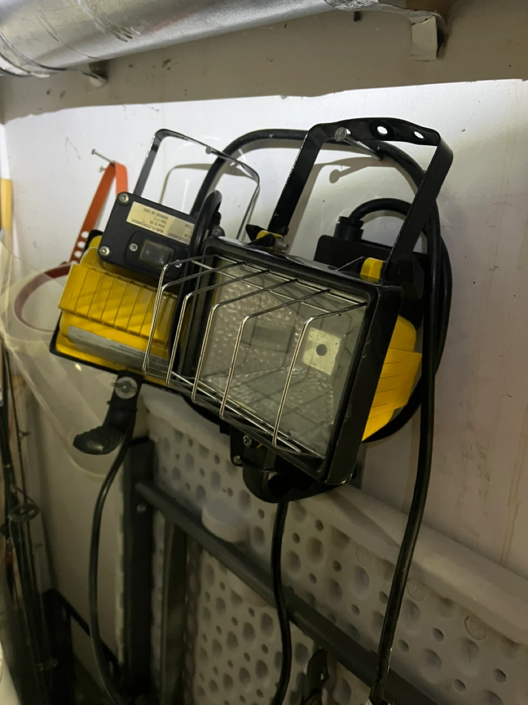 Portable halogen work light with a yellow housing and black metal frame. Features a metal cage around the glass. It's a useful light for workshops or temporary lighting needs.