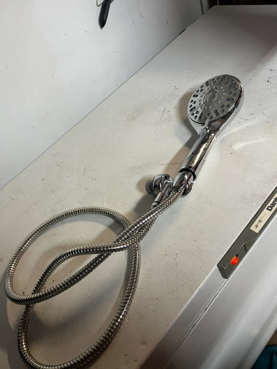 This is a chrome handheld shower head with a flexible hose. It's made of metal and features multiple spray settings. Comes with the hose and handheld unit.