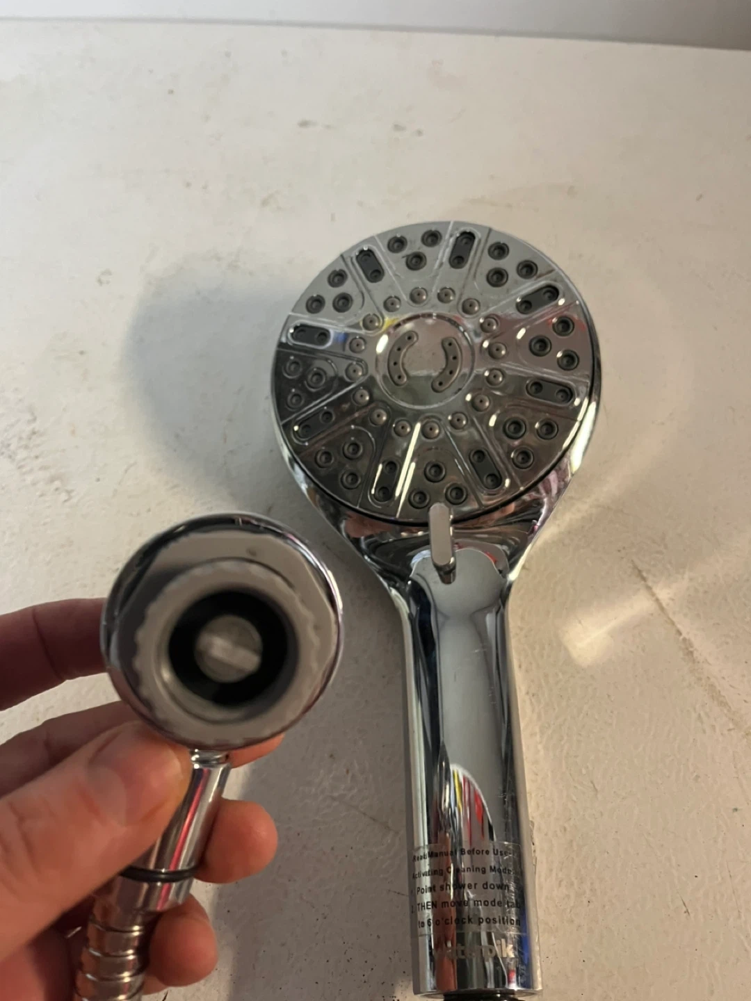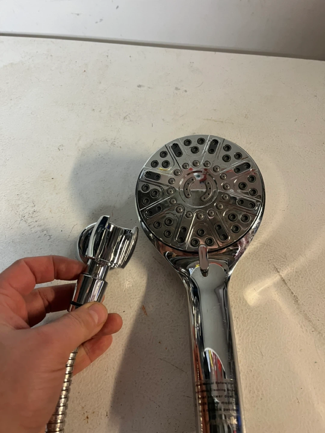 This is a chrome handheld shower head with a flexible hose. It's made of metal and features multiple spray settings. Comes with the hose and handheld unit.